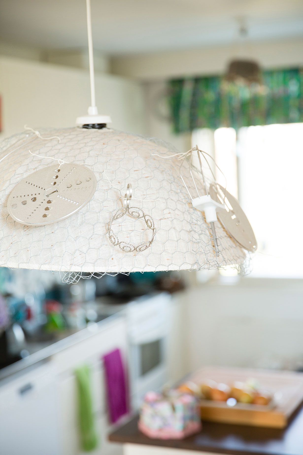 Kaikenlaista hullu voi kokeilla. Kirpparilamppu on päällystetty kanaverkolla, johon on helppo kiinnittää keittiöhenkistä kamaa: vanha vispilä, leikkuterä ja totimukin pidike. Tai mitä muuta vaan.
