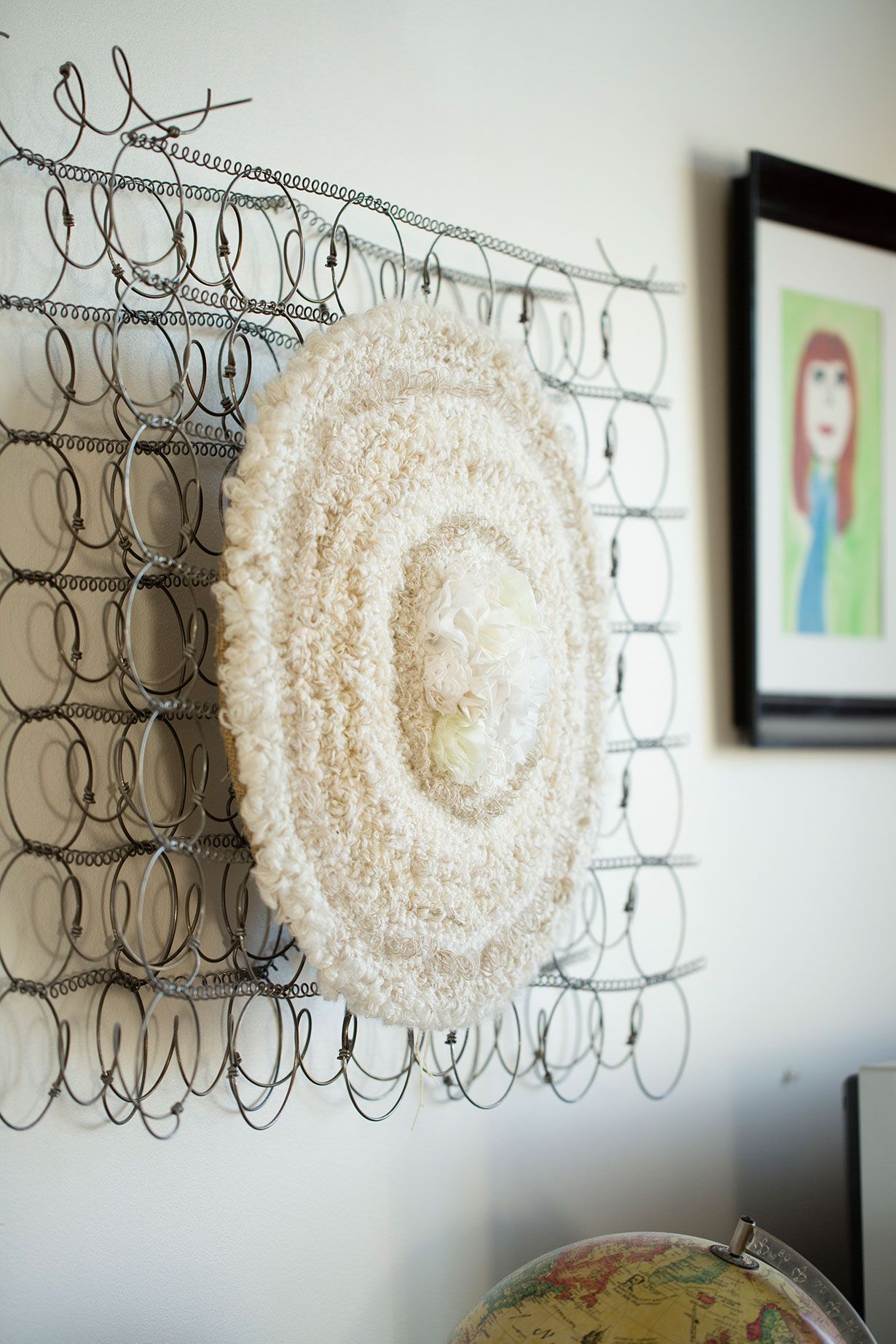 Paraatipaikalla on Saijan minulle 50-vuotislahjaksi tekemä valkoisen eri sävyissä hehkuva tuftaustyö. Tuftaus on helppo tapa tehdä ryijypintaa. Pala vanhan runkopatjan metallisisusta on sille ilmavan rouhea tausta. Pidän siitä, että kodissani olevilla töillä on tarina.