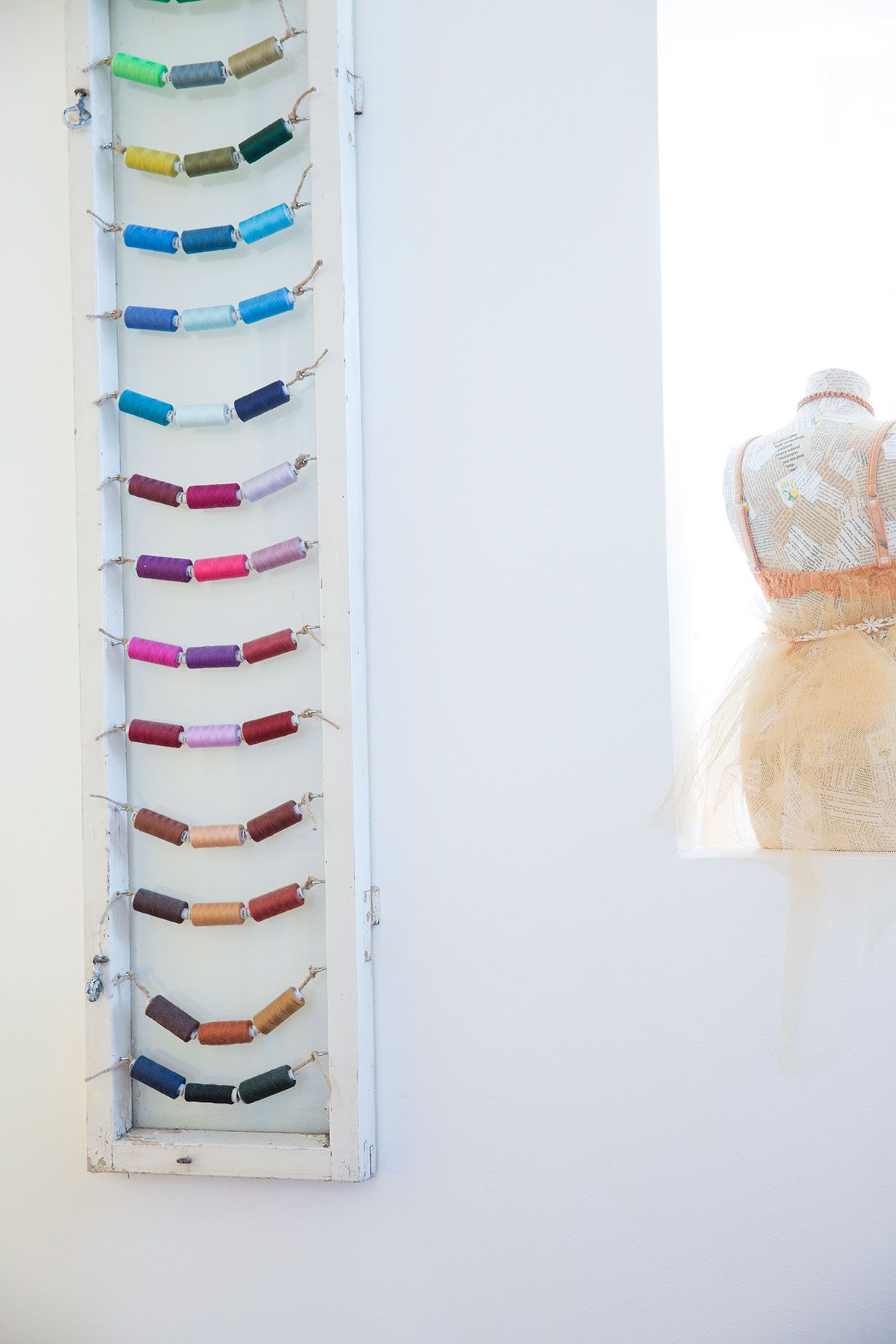 Vanha ikkunanpoka on kätevä lankateline, joka toimii samalla tauluna.