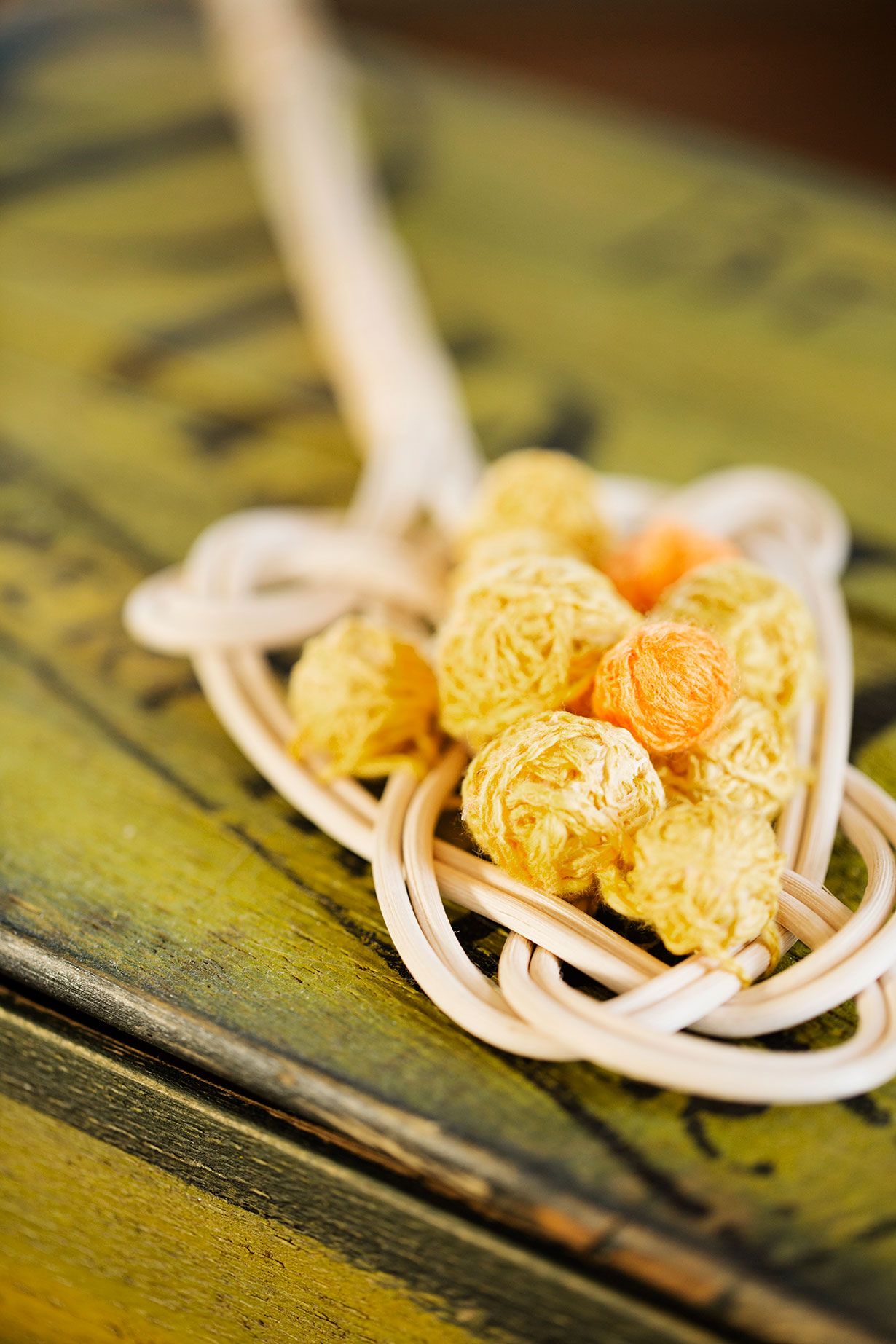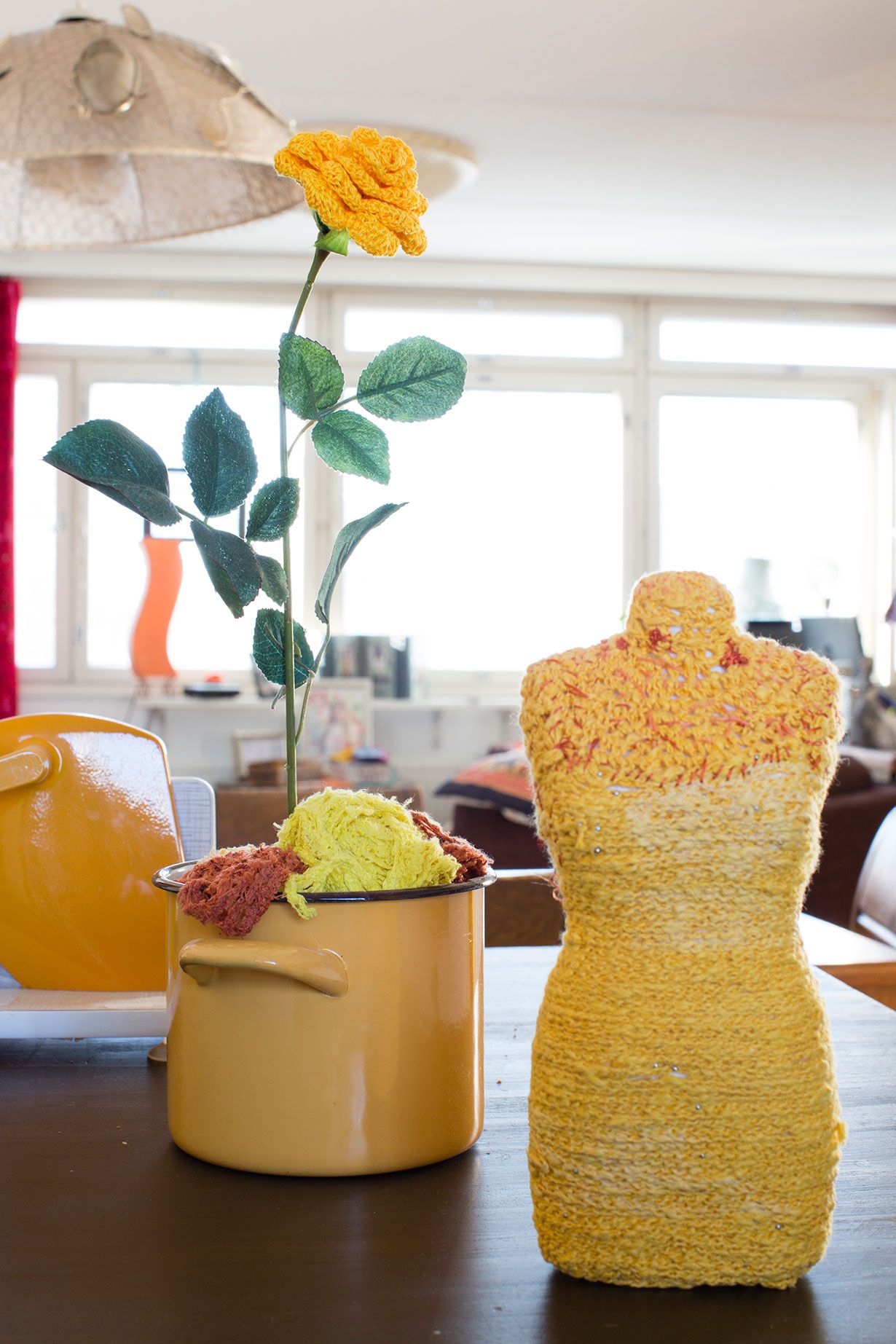 Usein sytyn kulahtaneista löydöistä, joiden ympärille voi syntyä väliaikainen tilateos. Keittiössäni oleva asetelma alkoi pari vuotta sitten loviisalaiskirpparilta ostamastani keltaisesta lankapussukasta. Mietin pitkään, tarvitsenko niin outoa väriä. Pian päällystin keltaisella langalla minitorson. Kohta sain ystävältäni synttärilahjaksi lankoja, jotka hän oli pakannut taloyhtiön metallikierrätyksestä löytämäänsä keltaiseen emalikattilaan. Niiden seuraksi oli ihan pakko ostaa Kankaanpään kierrätyskeskuksesta aito 70-luvun viipalointikone. Viimeksi asetelmaan pääsi keltainen virkattu ruusu, jonka sain haastateltavalta. Pöytätason sivulla odottaa komea lampaansarvi esille pääsyä. Sen alle pitäisi ehkä saada jokin pehmeä tekstiili.