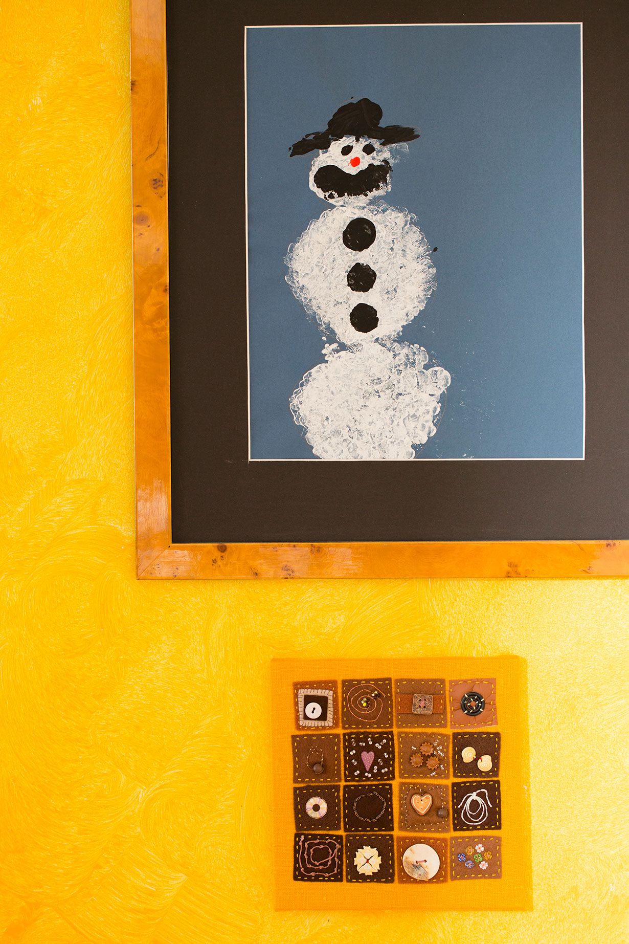 Lasten työt henkivät niin suurta pakotonta luovuutta, että tykkään katsoa niitä vuodesta toiseen. Olen järjestänyt lapsitaidenäyttelyn keltaiseen eteiseeni. Lasten muovailemat savikipot nostin reilusti vanhan radion päälle. Kuvan pienen tilkkutyön olen ostanut ahvenanmaalaiselta Hannele Ögård-Forsmanilta. Omissakin tekeleissäni huomaan samaa värikästä lapsellisuutta ja rajojen rikkomista. Käsityöni ovat varmasti monen mielestä kummallisia, mutta tärkeintähän kai on, että itse tykkää.