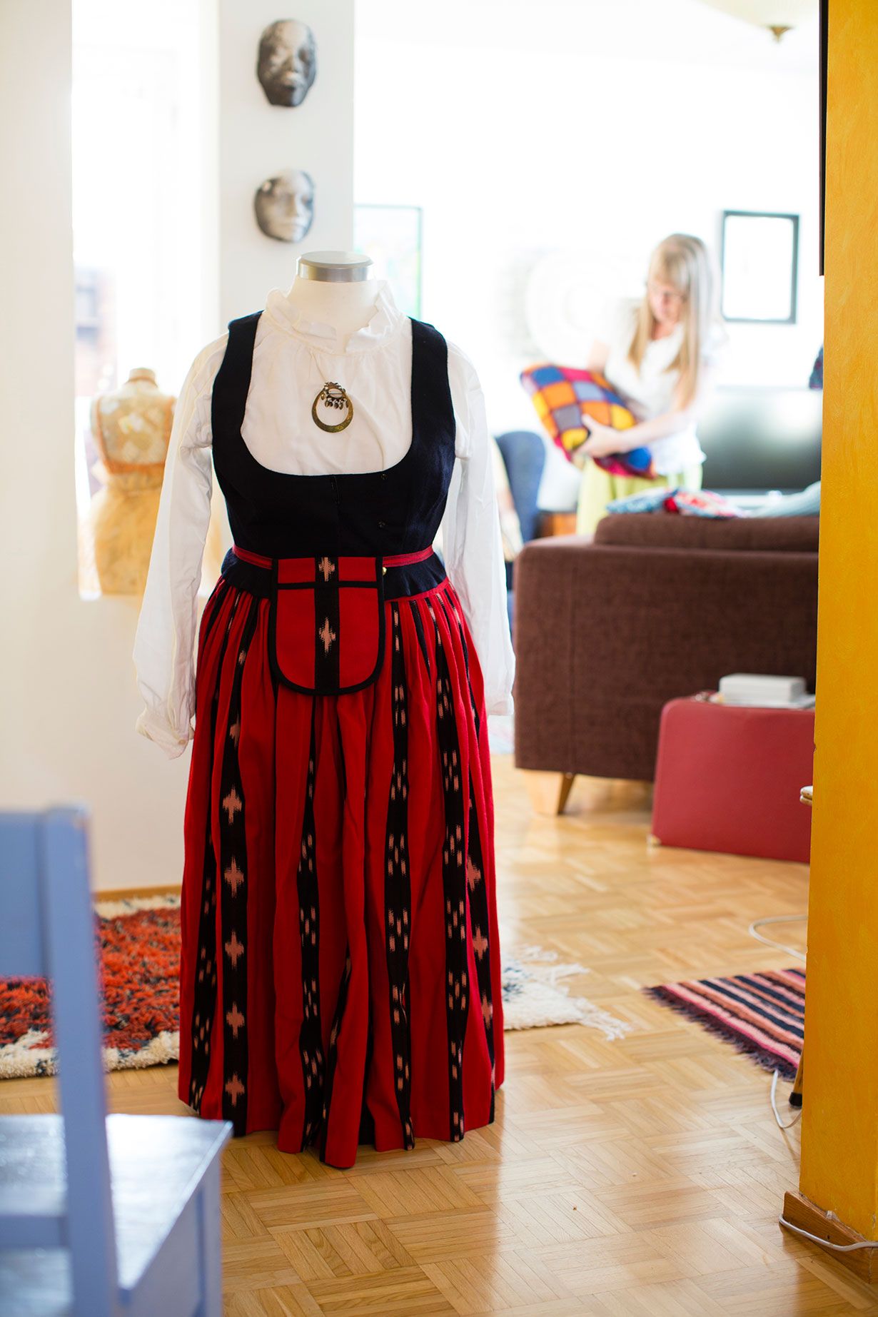 Toiselle torsolleni puen silloin tällöin Teuvan pukuni ja nostan ”tytön” olohuoneeseen. Kaunista kansallispukua kannattaa pitää esillä.