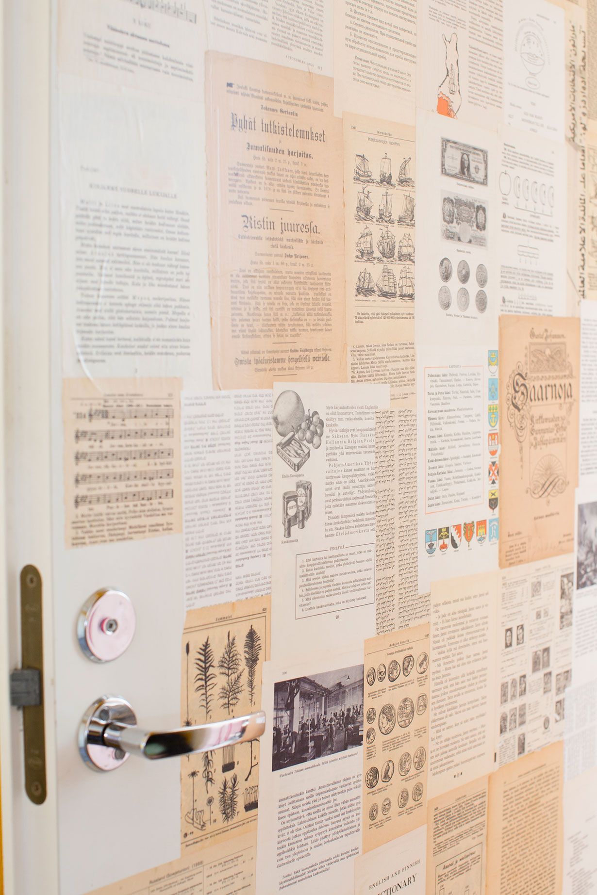 Moni sisustusratkaisu on lähtenyt rahattomuudesta. Esimerkiksi yli 20 vuotta vanhat melamiiniovet ovat kulahtaneita. Eteisen oven päällystin vanhojen kirjojen sivuilla ja lakkasin. Siitä tuli aika soma. Harkitsen seinän tapetoimista samalla tekniikalla.