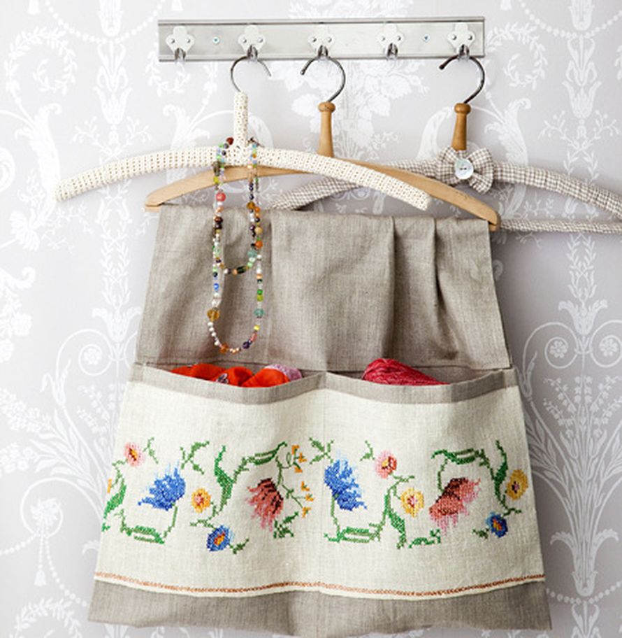 Ompele kätevä säilytyspussi, joka riippuu henkarista. Voit käyttää vanhan, kirjotun kankaan koristeena.