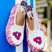 Tee vielä tossuihin nilkkojen helminauhat. Kiinnitä ompelulanka tossun taakse valkoisen kaarikerroksen juureen. Pujota noin 11 cm pitkä helminauha ja kiinnitä nauha keskelle tossun sivua. Pujota sitten noin 16 cm pitkä helminauha ja kiinnitä nauha tossun toiselle sivulle. Pujota vielä noin 11 cm pitkä helminauha ja kiinnitä nauha tossun taakse.