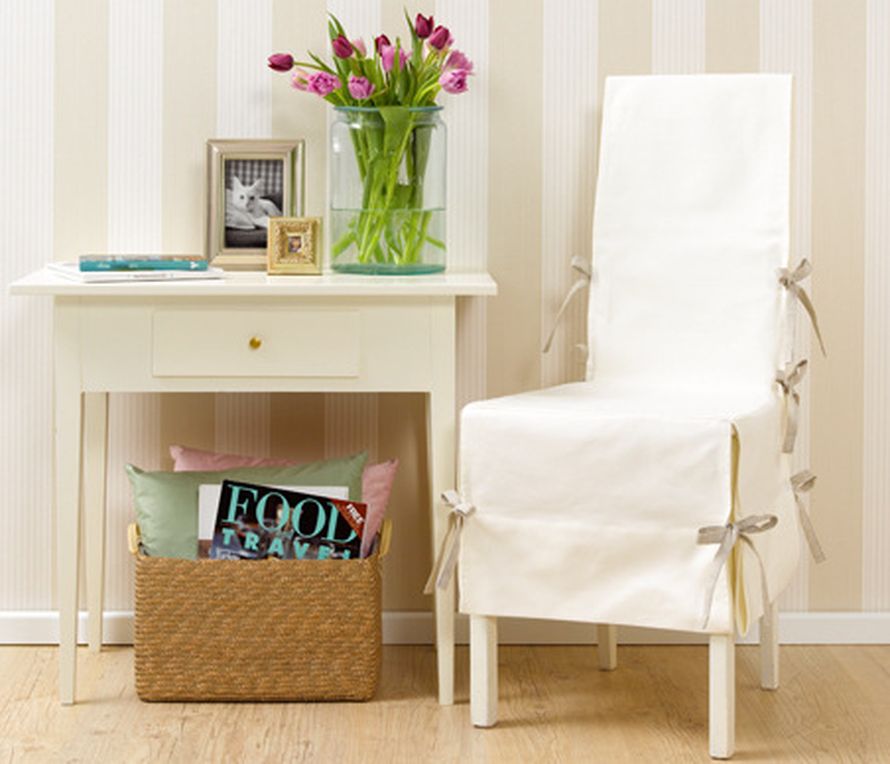 Tuolin muotoja myötäilevä huppu raidallisesta tai yksivärisestä kankaasta on raikkaan moderni. Romanttisempi ilme syntyy vaikka ruusukuosilla. Ryhdikäs huppu sopii pitkän ruokapöydän tuoleille.