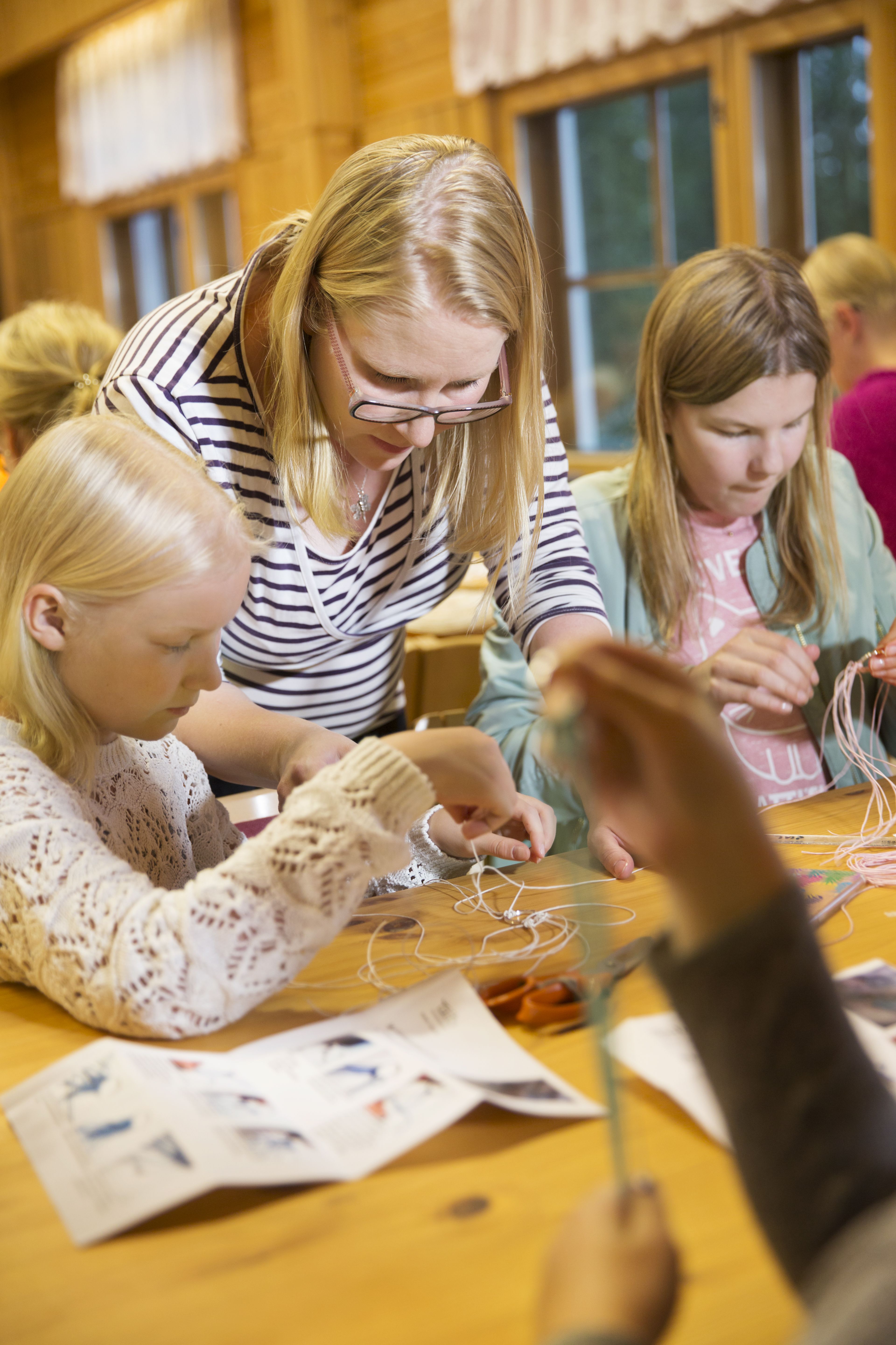 Suurimmalle osalle makramee on uusi tuttavuus. Ohjaaja Päivi neuvoo kädestä pitäen ja jakaa vielä jokaiselle kirjalliset ohjeet. Kolmen tunnin kurssin maksaa kullekin osallistujalle 15 euroa.