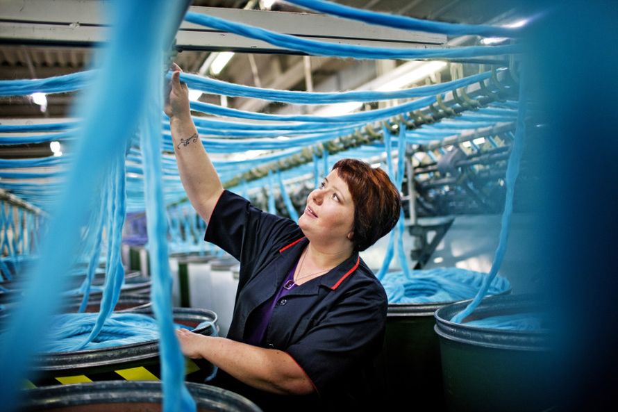 Kirsti Tuviala on viihtynyt talossa yli 20 vuotta. Hän on joka paikan höylä, mutta suosikki on kehruukone. Töitä paiskitaan kahdessa vuorossa klo 6–14 ja 14–22. Tuotannossa on 80 ihmistä.– Aikanani on tullut paljon uusia koneita ja langat ovat tulleet värikkäämmiksi, Kirsti kertoo.