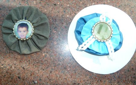 Askartelu Amalian Mira Ekonen ja Minna Ropponen opastivat kierrätyskorujen tekemistä kankaanpalasista ja pullonkorkeista. Korkki litistettiin, siihen liimattiin valokuva, joka lakattiin ja kiinnitettiin kankaasta tehdyn ruusukkeen päälle. Moni teki ”mitalin” lapsenlapsen kuvasta.