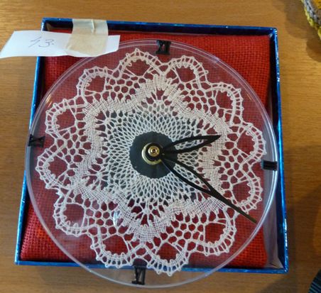 Toiseksi tuli tamperelaisen Anita Ilosen hieno nypläystyö, joka oli pujotettu läpinäkyvän muovisen seinäkellon sisään. Siinä sitä voi ihailla päivittäin!