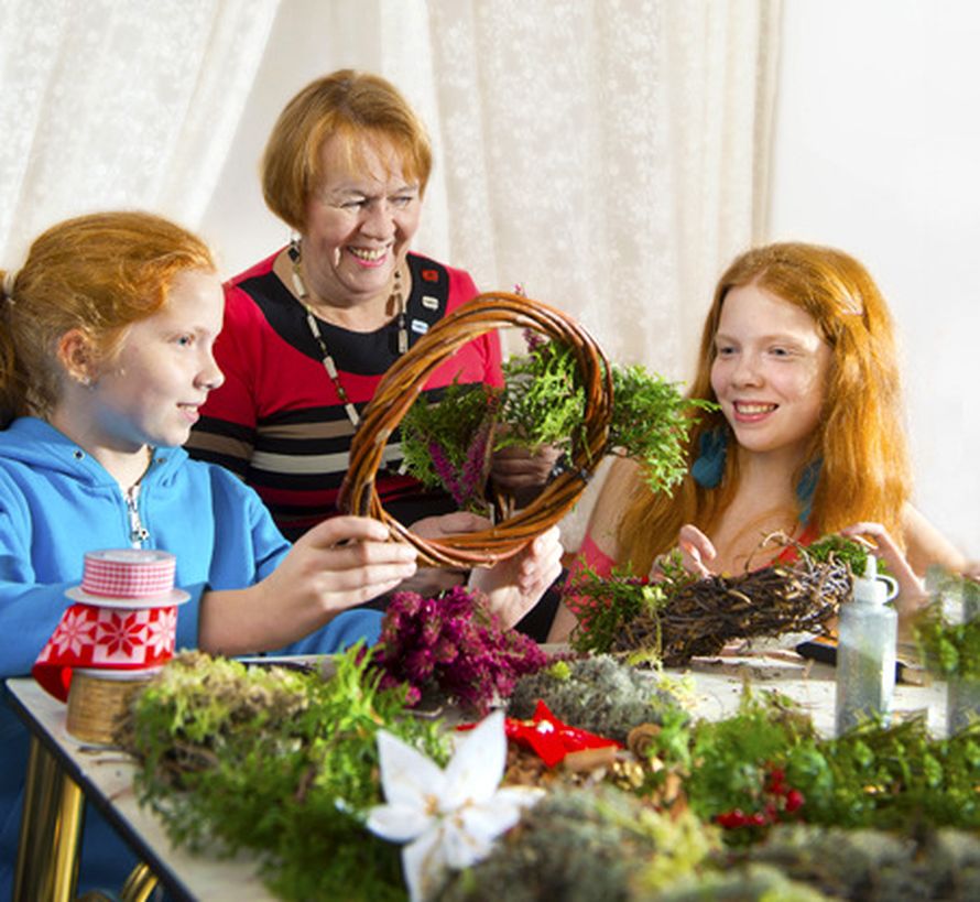 Siinä menee tunti poikineen, kun Armi ja Anni, 12, pääsevät mummin, Pirjo Nymanin, 54, kanssa askartelemaan. Nyt työn alla on joulukranssi.
