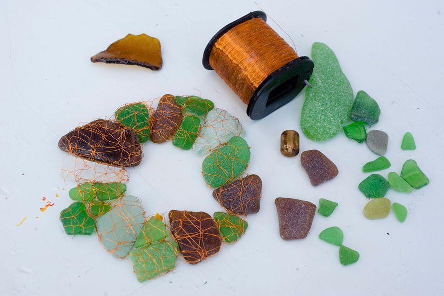 Värikkäät lasipalat Eija löysi Portugalista rannalta. Ne olivat hioutuneet reunoiltaa sileiksi ja Eija alkoi virkata niitä ketjuksi käämilangalla. Tämäkin on vielä haudutteluvaiheessa, ja siitä voi tulla mitä vain.