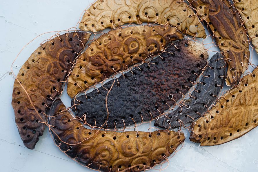 Eijaa kiehtoo keramiikan ja kirjonnan yhdistäminen. Näistä palasista tulee jotain, ei tiedä vielä mitä, mutta kiinnostavia ne ovat.