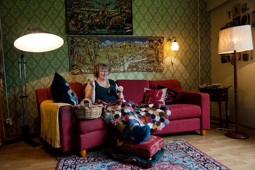 Eijalla on eri puolella kotia käsitöitä odottamassa tekijäänsä. Ihanien gobeliinien luona hän ompelee vanhoista vanuineista vaillapaidoista tilkkupeittoa.