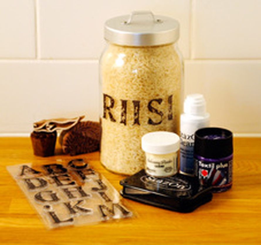 Kätevää keittiöön! Kokeile askartelusta tuttuja leimasimia ja leimasinvärejä lasille, puulle ja kankaalle. Purkit ja pyyhkeet somistuvat persoonallisesti.
