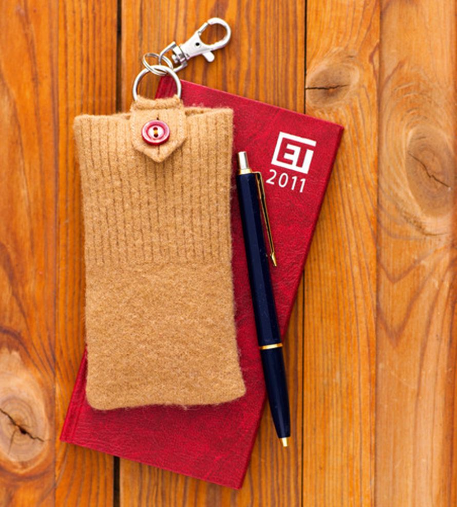 Leikkaa neuloksesta kännykän kokoa vastaava pala, käännä oikeat puolet vastakkain ja ompele pussiksi. Käännä työ oikein päin.