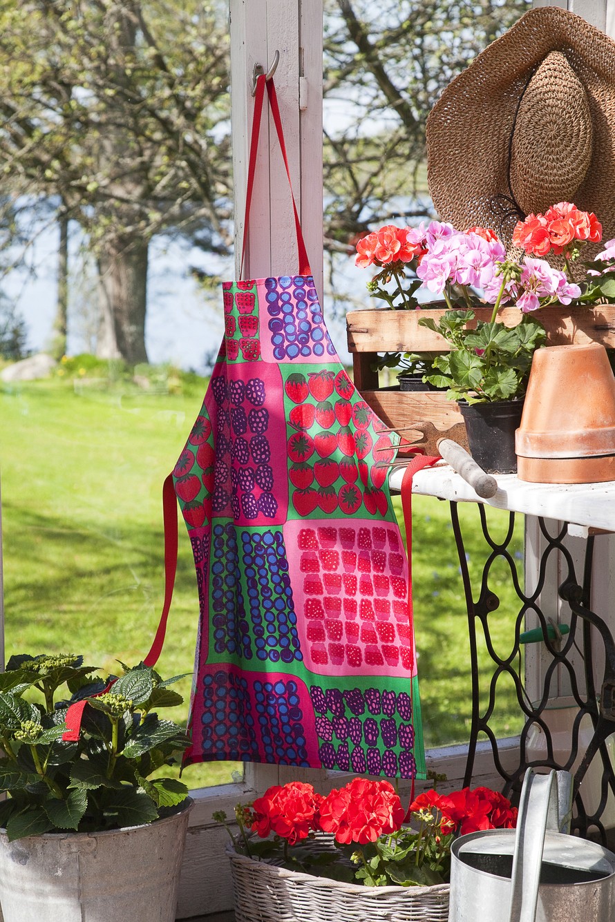 Helppotekoinen essu ommellaan vahakankaasta. Se suojaa niin puutarhuria kuin kesäkokkia.