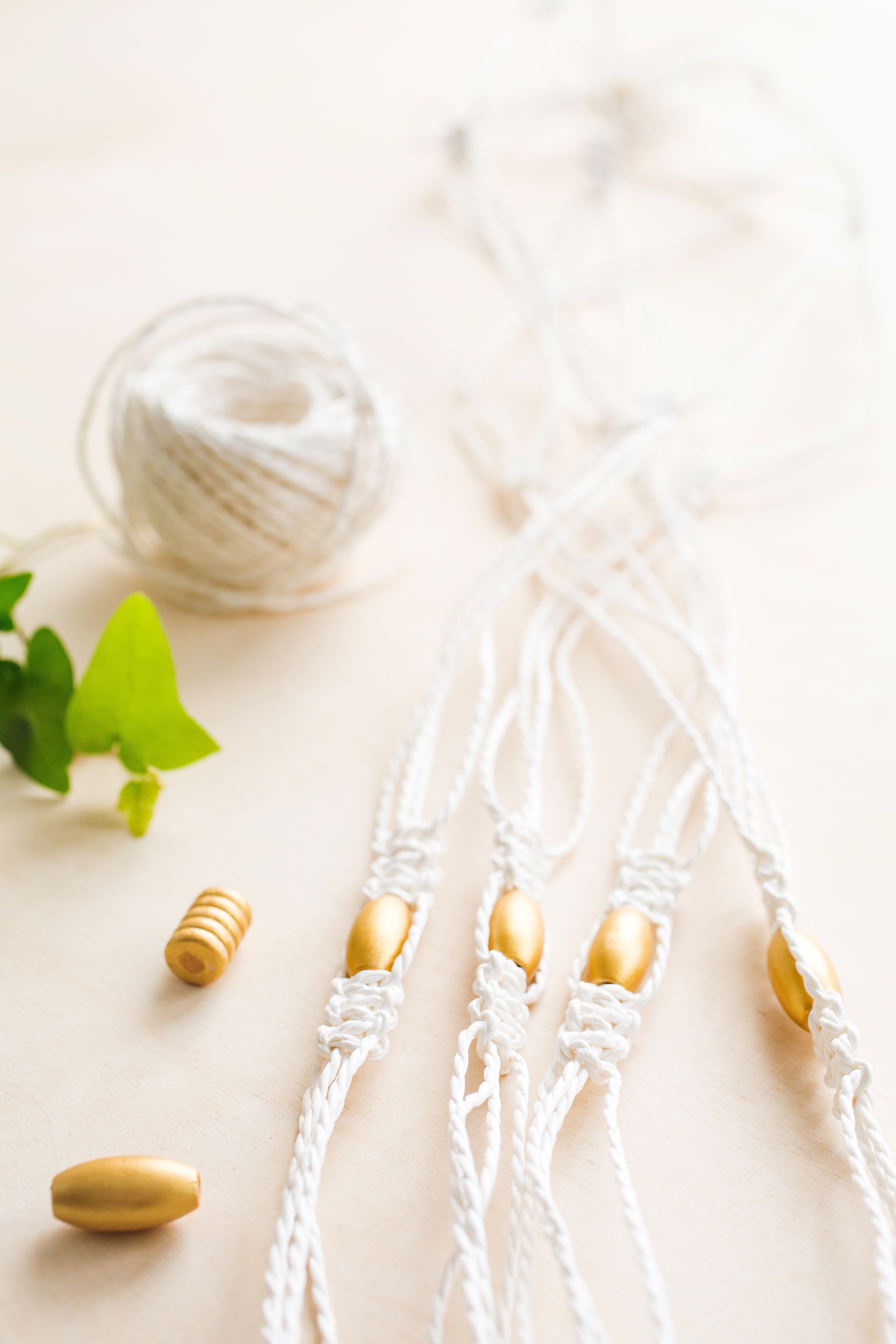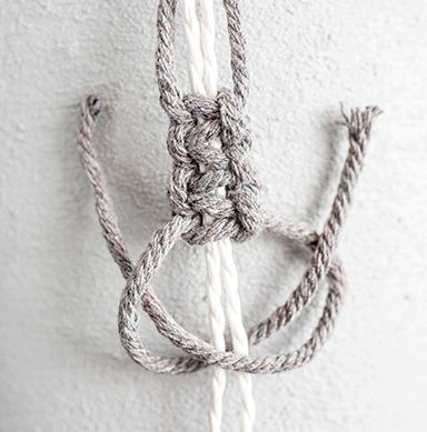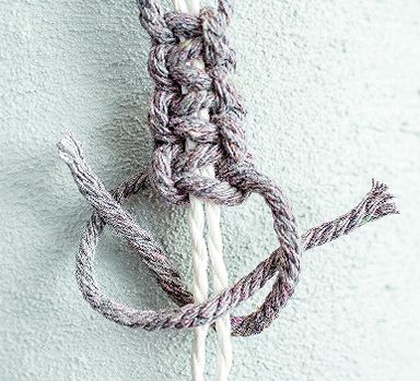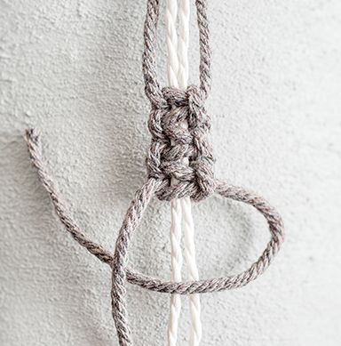 - Sovita amppeliverkkoa ruukkuun ja solmi kaikki narut yhteen vetosolmulla noin 9 cm:n päähän viimeisistä solmuista (tai sopivaan kohtaan). Leikkaa narut 5 cm:n pituisiksi tai haluamaasi pituuteen.