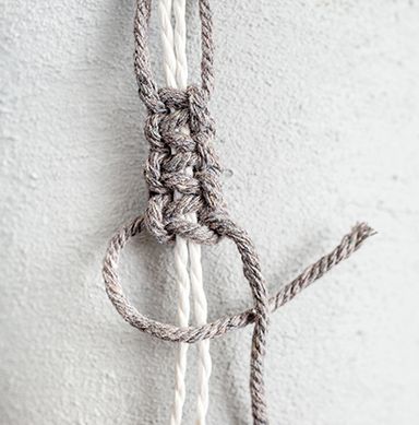 - Ota pätkä narua, kiepauta se lenkin ympäri ja solmi umpisolmulla. Sinulla on nyt 16 kpl noin 2 m pitkiä naruja. Kiinnitä lenkki langalla ovenkahvaan tai tuolin selkänojaan.