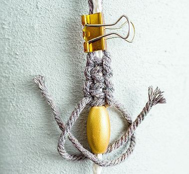 - Solmi kaksoistasosolmuja ohjeen mukaan (kuvaohje alla, 1.–4.) 4 x 4 narulla (kaikki narut ovat tässä valkoisia). Ensimmäiset solmut tulevat noin 13 cm:n päähän yläreunasta. Solmi 3 kaksoistasosolmua, lisää kultahelmi keskilankoihin ja solmi taas 3 kaksoistasosolmua.