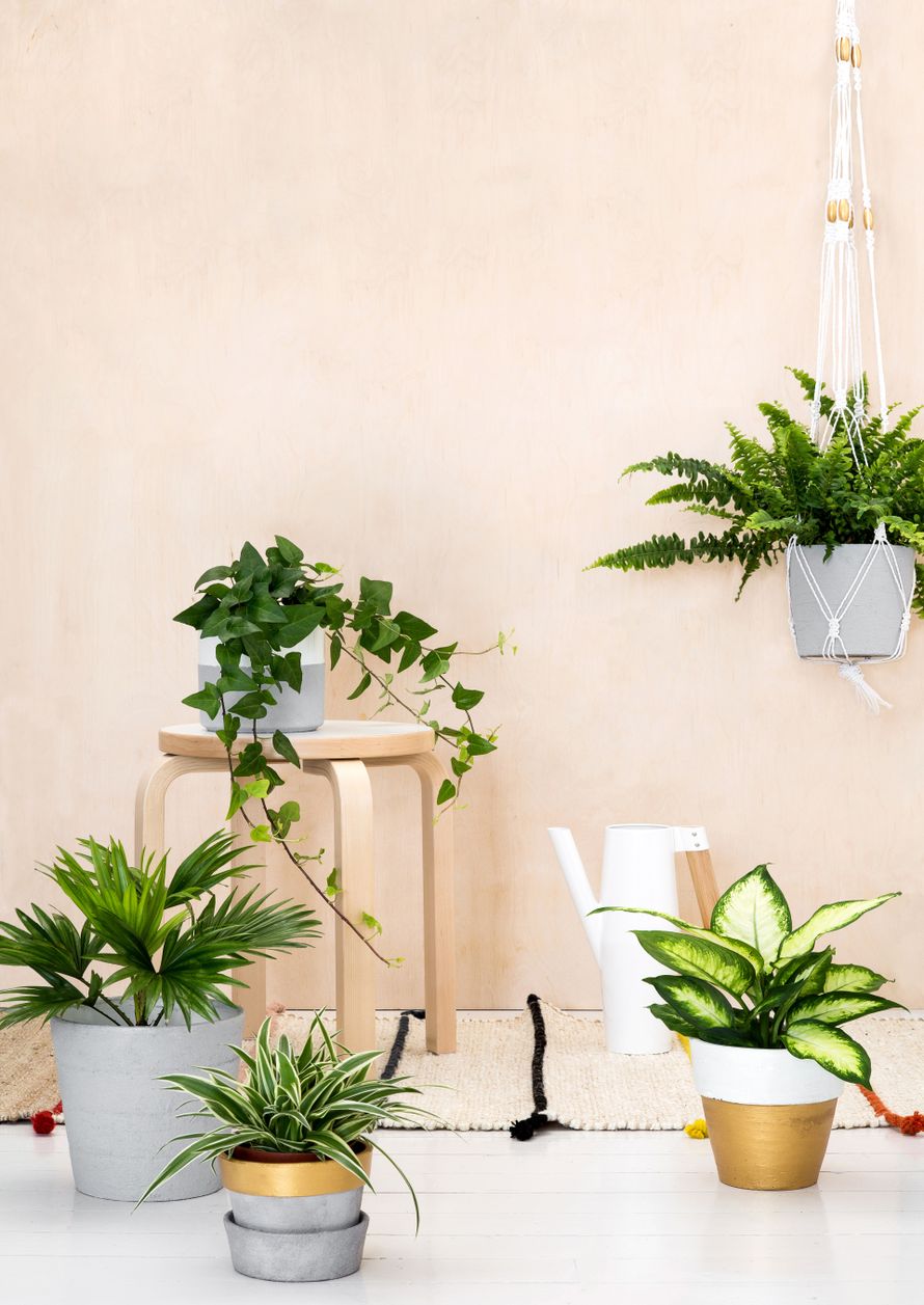 Paperinarusta solmittu amppeli nostaa muhkean saniaisen silmien tasalle. Ruukut uudistavat betonimaalilla ja kullan sävyllä.