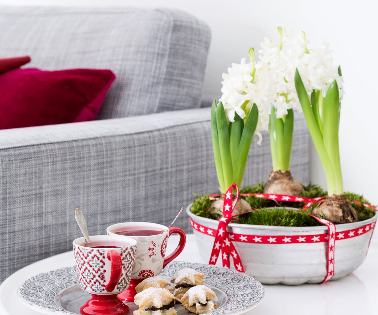 Saitko joulutervehdyksinä yksittäisiä hyasinttejä? Kokoa niistä näyttävä asetelma ja somista kukkien ruukut juhlaan.