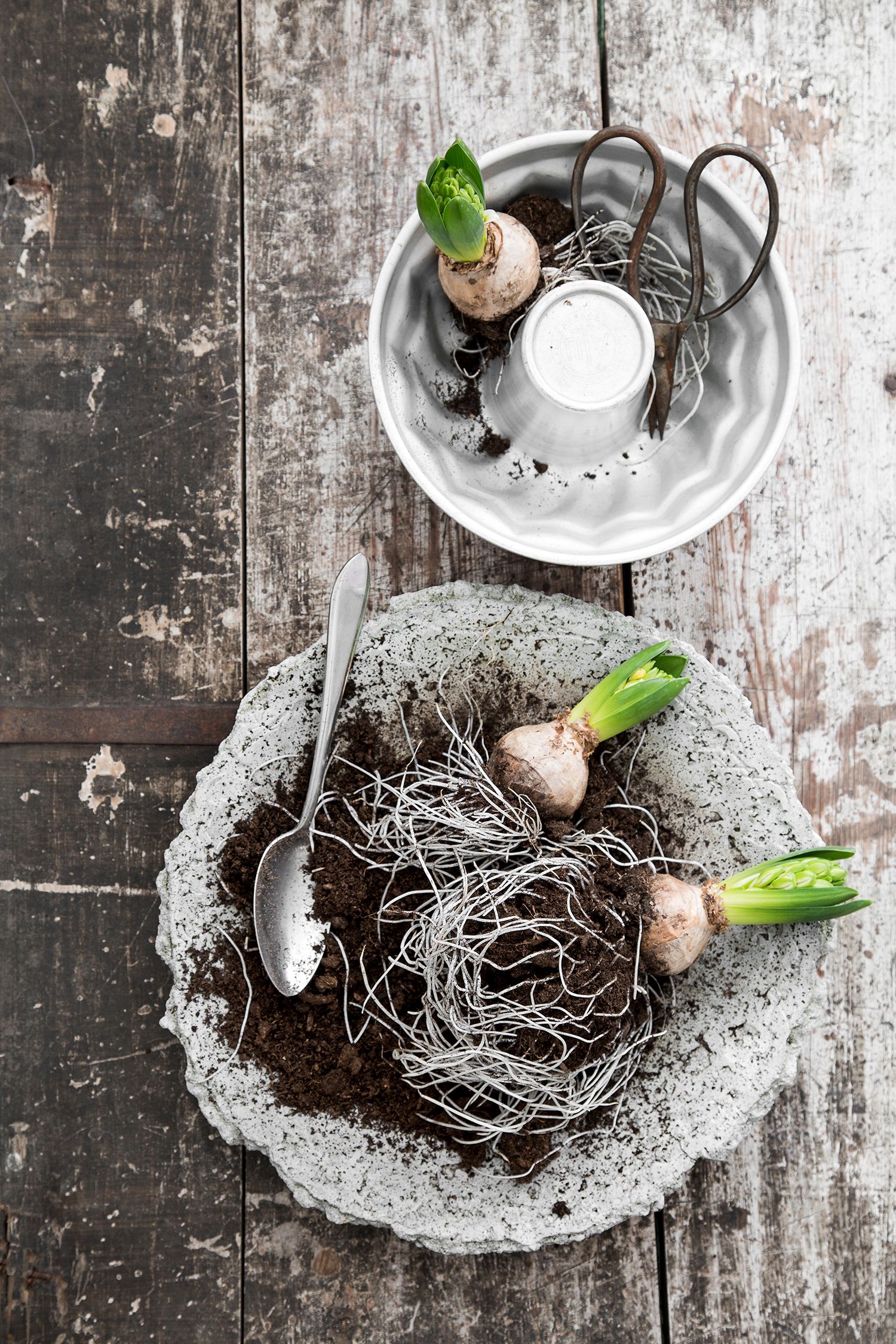 Vaihda kuihtuneen hyasintin tilallle uusi. Siirrä kukkineet sipulit lehtimeen pimeään ja istuta ne keväällä.