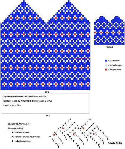 - Peukalo: Poimi 9 s apulangalta ja toiset 9 s luotujen silmukoiden reunasta sekä 1 s kummastakin peukalon reunasta (=20 s). Jaa silmukat kolmelle puikolle (7s/7s/6s). Neulo peukalo kirjoneuleena ruutupiirroksen mukaan. Tee peukalon kärkikavennukset joka kerroksella, neuloen joka puikon alussa 2 s oikein yhteen, kunnes jäljellä on 4 s. Vedä lanka silmukoiden läpi ja kiristä.