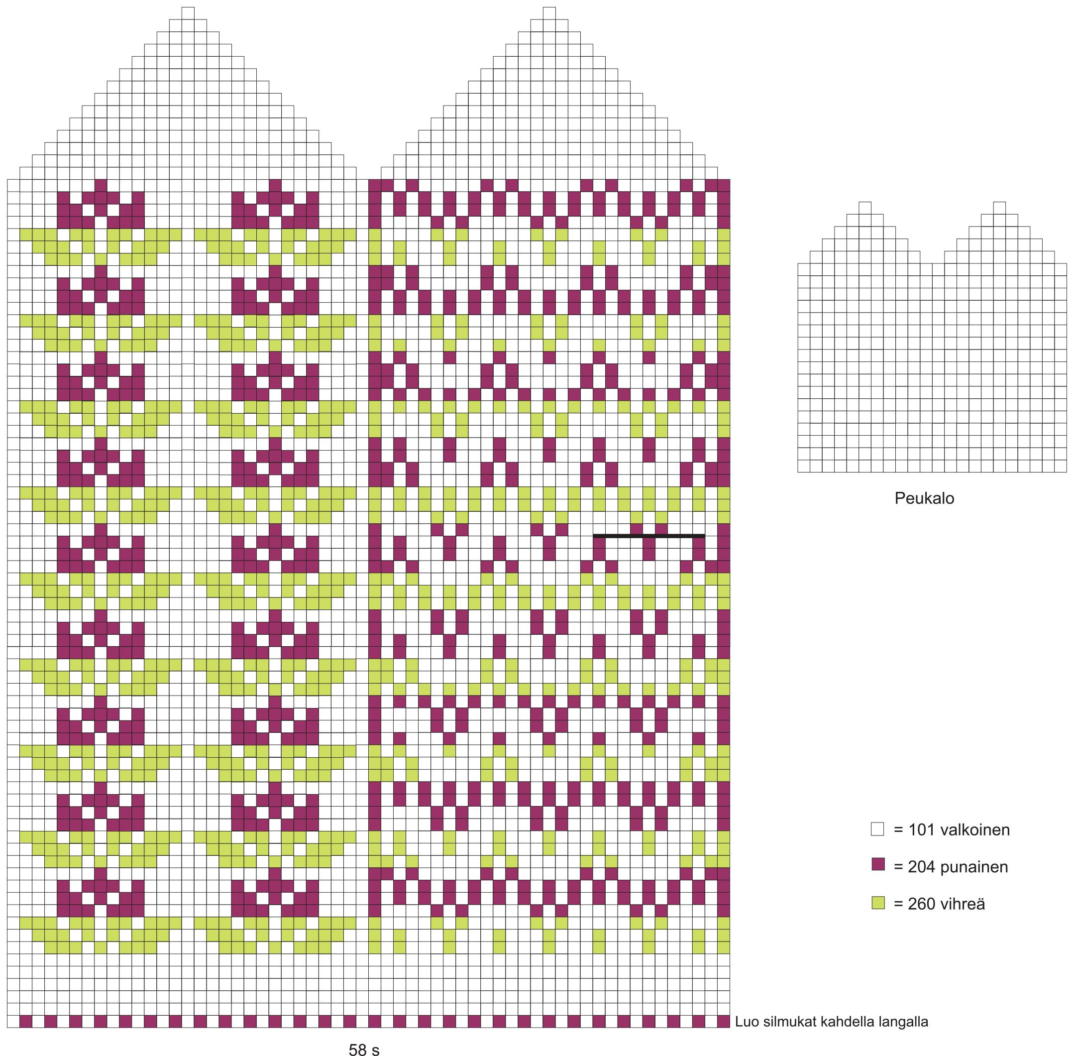 - Peukalon paikka: Kun olet neulonut kirjoneuletta 34 kerrosta, ota peukaloa varten 9 s apulangalle, luo uudet 9 s ja jatka kirjoneuletta vielä 29 krs.