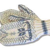 Peukalo: Poimi puikolle 10 s apulangalta ja toiset 10 s silmukat luotujen silmukoiden reunasta sekä 1 s peukaloaukon kummastakin reunasta (= 22 s). Jaa silmukat kolmelle puikolle (7s/7s/8s) ja neulo peukalon suoraosuus (16 krs) kirjoneuleena piirroksen mukaan. Tee peukalon kärkikavennukset samoin kun kämmenosan kavennukset, mutta jätä kavennusten väliin nyt vain 1 sininen silmukka.