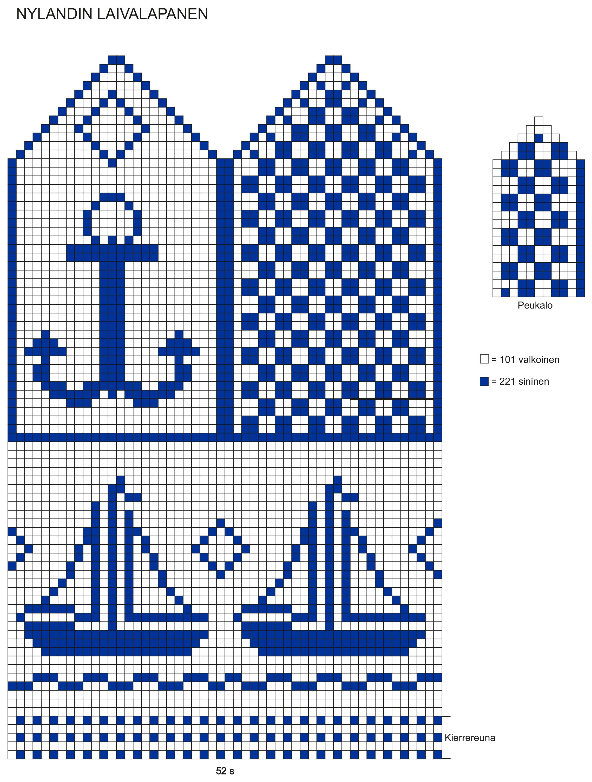 Neulominen: Luo valkoisella 52 s ja neulo 1 krs oikein. Neulo seuraavaksi kierrereuna (katso värit ruutupiirroksesta, alla). Yksi kierrekerros muodostuu kahdesta kerroksesta. 1.krs: neulo nurjaa kahdella värillä. Neulo 1 s sinisellä, jätä lanka työn eteen itseesi päin, neulo 1 s valkoisella, jätä lanka työn eteen itseesi päin. Nosta sininen lanka valkoisen yli ja neulo 1 s sinisellä. Nosta valkoinen lanka sinisen yli ja neulo 1 s valkoisella. Jatka näin krs loppuun. 2. krs: neulo koko krs oikeaa neuletta valkoisella. Toista näitä kahta kerrosta vielä 2 kertaa ja aloita kirjoneule ruutupiirroksen mukaan. Peukalon paikka: kun olet neulonut kirjoneuletta 37 krs, ota peukaloa varten puikon alusta 10 s apulangalle ja luo uudet 10 s. Jatka kirjoneuletta vielä 28 krs.