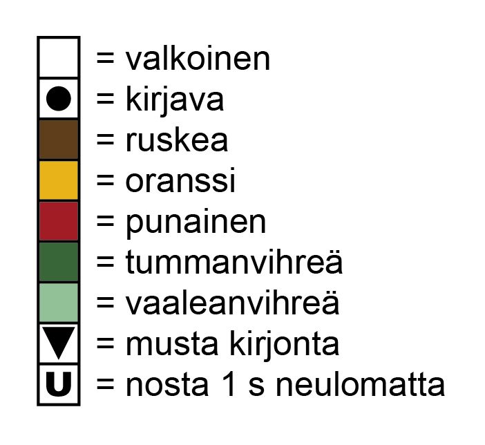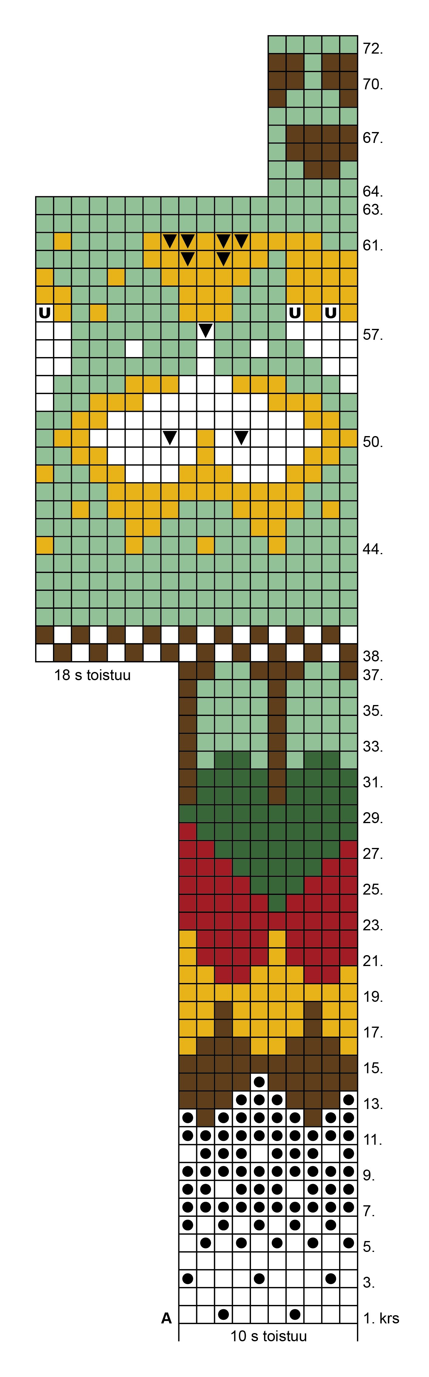 57. krs: Neulo kirjoneuletta oranssilla ja vihreällä langalla ja nosta U-kirjaimella merkityt s:t neulomatta puikolle.