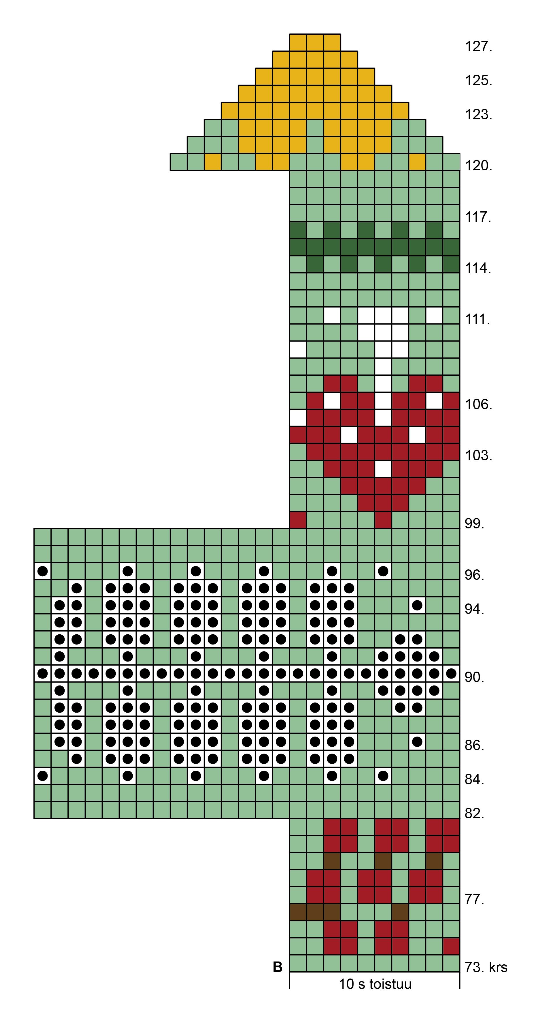 Poimi kantalapun vasemmasta reunasta 13 s, 72. krs:n reunasta 1 s (0 vihreä krs) ja 1 s 1. ja 2. puikon välistä. Siirrä vielä kantapohjan 5 s 1. puikolle. Poimi 3. ja 4. puikon välistä 1 s, 72. krs:n reunasta 1 s ja 13 s kantalapun reunasta. Siirrä loput 6 s tälle samalle puikolle = 63 s (20+11+11+21 s). Kerroksen vaihtumiskohta on nyt kantapohjan keskelle. Jatka kirjoneule piirroksen B mukaan.