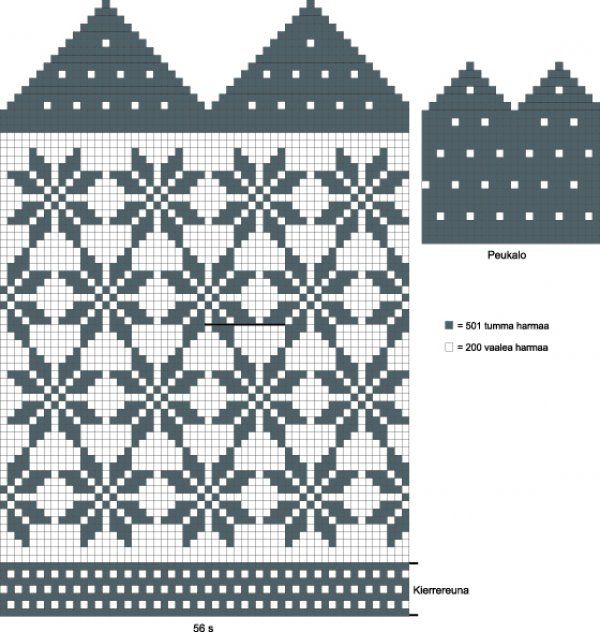 - Peukalonpaikka: Kun olet neulonut kirjoneuletta 29 krs, ota peukaloa varten puikon reunasta 11 s apulangalle, luo uudet 11 s ja jatka kirjoneuletta ruutupiirroksen mukaan vielä 23 krs. Neulo sitten sileää neuletta v.harmaalla 2 krs ja t.harmaalla 3 krs. Aloita kärkikavennukset, neuloen edelleen kirjoneuletta. Kavenna joka kerroksella; 1. ja 3. puikon alussa toinen ja kolmas silmukka yhteen ylivetäen ja 2. ja 4. puikon lopussa kolmanneksi ja toiseksi viimeinen silmukka oikein yhteen. Kun jäljellä on 4 s, vedä lanka niiden läpi ja kiristä. Neulo toinen lapanen peilikuvaksi.