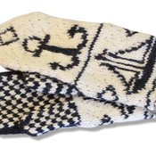 Jatka kirjoneuletta kaikilla 56 s:lla. 3. krs: Neulo 1. ja 2. puikon s:t, jatka 4 o valkoisella, *3 o mustalla, 3 o valkoista*, toista *–* vielä 3 kertaa ja neulo vielä 1 o valkoisella. 4. krs: Neulo kuten edellinen krs mutta tee 3. puikon alussa yvk ja kavenna 4. puikon lopussa 2 o yhteen = 54 s. Jatka kirjoneuletta kunnes terässä on 7 ruutua. Katkaise sitten molemmat langat ja aloita sukan kärki turkoosilla langalla puikoilla nro 4.