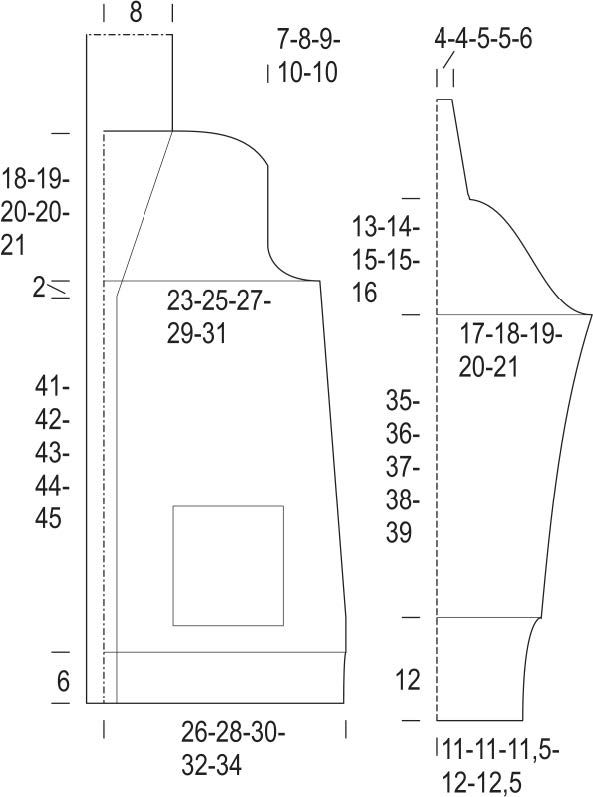 - Huom. kun kappaleen korkeus on 47 (48) 49 (50) 51 cm, päätä molemmissa reunoissa joka 2. krs 1 x 6 (6) 7 (7) 8 s, 1 x 3 s, 2 (3) 3 (2) 2 x 2 s, 13 (14) 15 (16) 17 x 1 s ja vielä joka 4. krs 8 (7) 7 (9) 9 x 1 s.