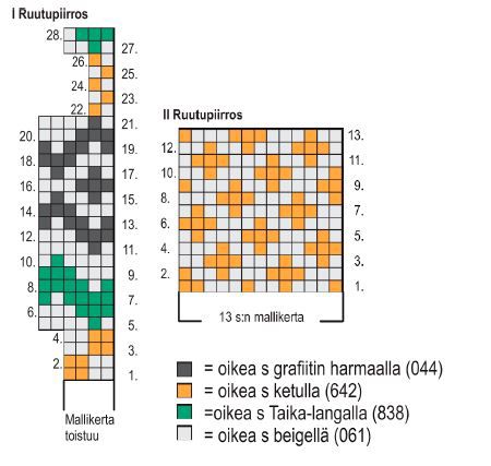 - Neulo toisen taskun joustin samalla tavalla ja neulo sitten kirjoneuletta II ruutupiirroksen mukaan. Toista 13 s mallikertaa tarpeen mukaan ja toista ruutupiirroksen kerroksia 1-13. Kun kappaleen korkeus on 14 cm, päätä silmukat.
