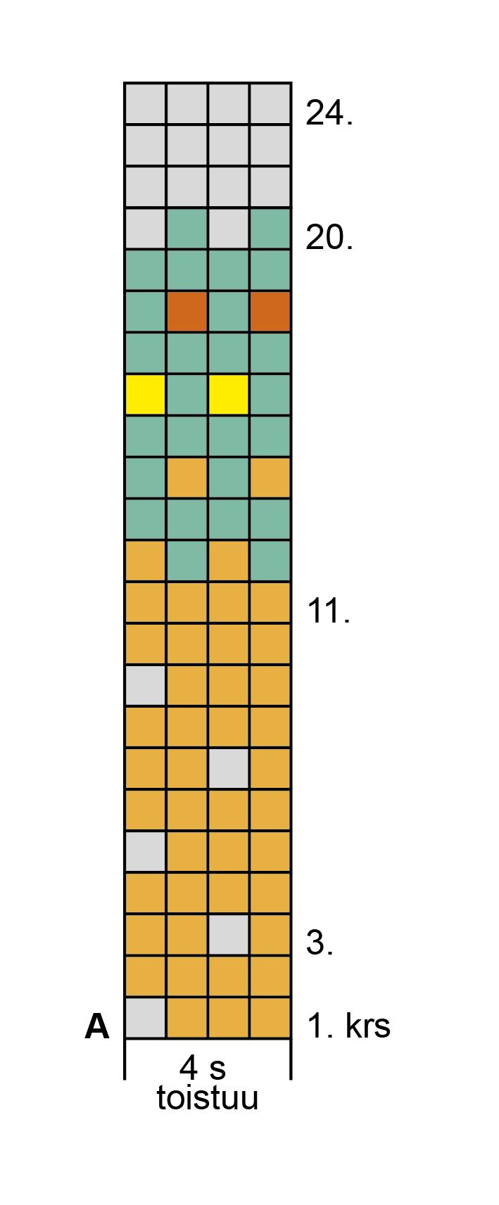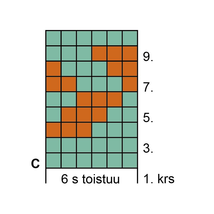 5. krs: *2 n, nosta 3 s neulomatta, vedä 1. s kahden seuraavan yli ja siirrä nämä 2 s takaisin vasemmalle puikolle, neulo 1 o, lk, 1 o*, toista *-*. Toista 1.-5. krs:ia vielä 3 kertaa. Neulo sileää neuletta 3 krs ja kavenna 4. puikon lopussa 2 o yht. = 64 s. Aloita kirjoneule ruutupiirroksen A mukaan ja neulo 20 krs. Neulo sitten 3 krs sileää neuletta harmaalla ja aloita varren kavennukset krs:n vaihtumiskohdan molemmilla puolilla.