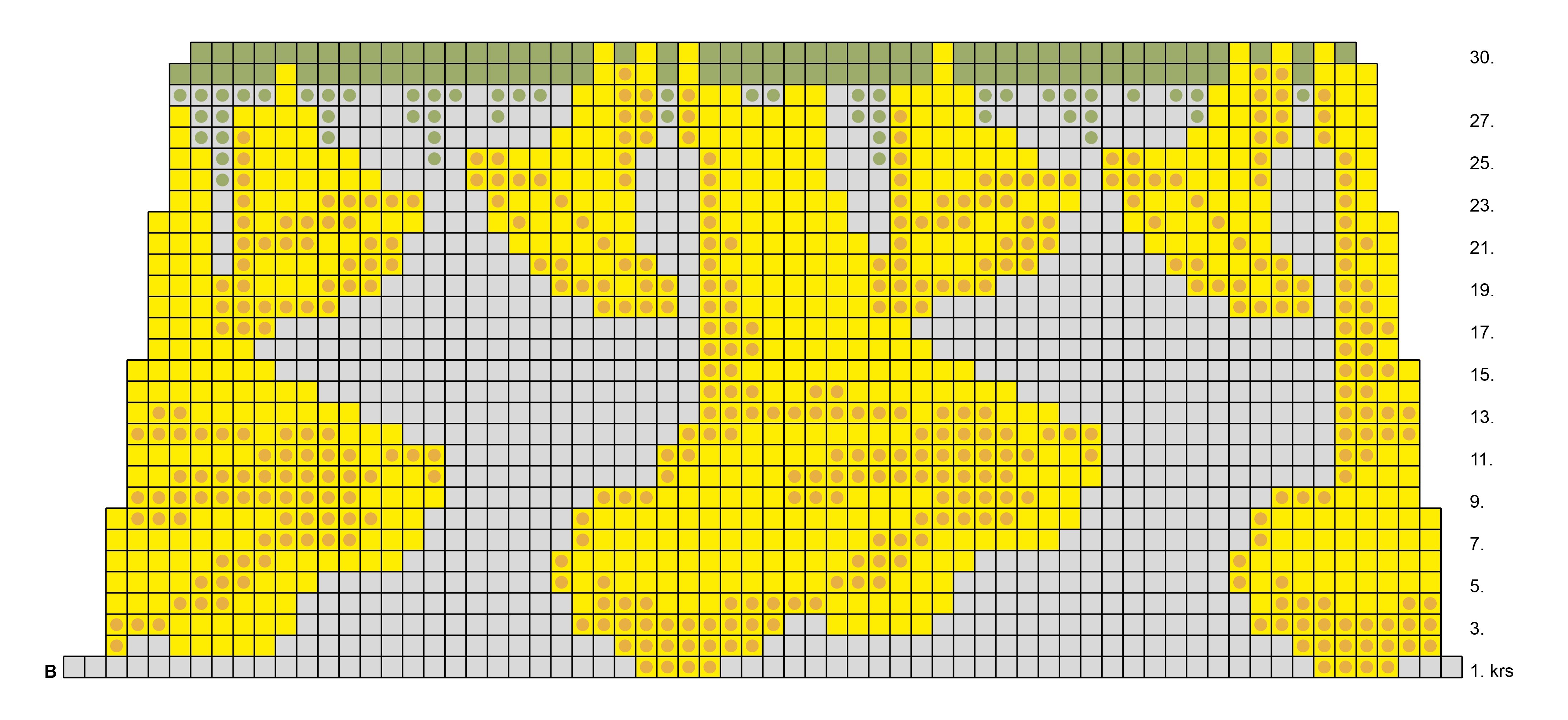 24. krs: Aloita kanttarelli-kuvio piirroksen B mukaan. Neulo sienet keltaisella ja tausta vaaleanharmaalla langalla. Sido taustan ja kuvion langat aina tarvittaessa joka 3.-4. s:n taakse, jotta nurjalle ei muodostu pitkiä lankajuoksuja. Tee nämä lankajuoksujen sitomiset aina lomittain edellisiin nähden. Lisää hunajankeltaiset kuvio-osat jälkikäteen silmukoita jäljitellen.