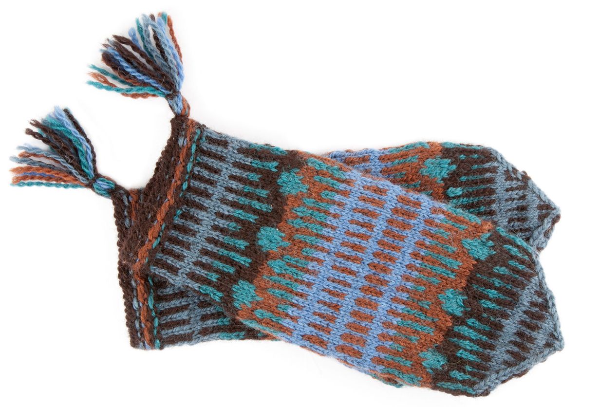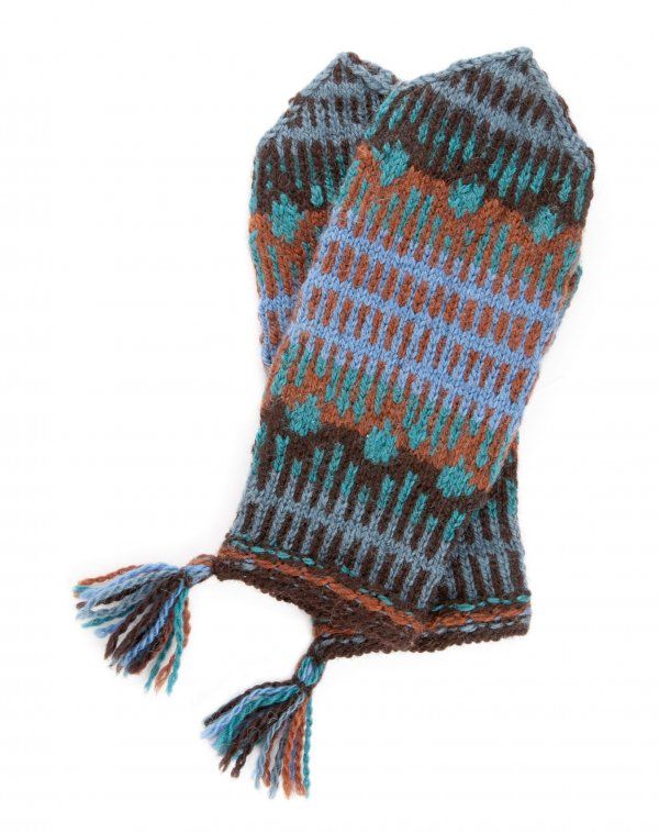 - Päättele langanpäät ja höyrytä lapaset kevyesti. Tee lapasen suuhun tupsut. Ota n. 20 kpl 15 cm:n mittaisia pätkiä (esim. 4 kpl kutakin väriä) ja kiinnitä ne keskikohdasta nippuna lapasen suuhun. Kierrä tummanruskealla langalla ”varsi” n. 1 cm:n päähän tupsun kiinnityskohdasta ja päättele huolellisesti.