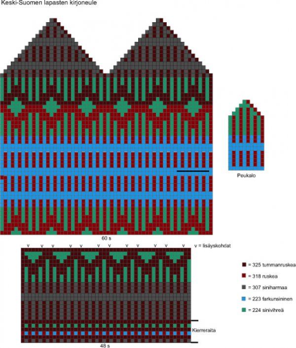 - Ota peukaloa varten 9 s apulangalle. Luo tilalle uudet silmukat ja jatka kirjoneuletta piirroksen mukaan. Kavenna 1. ja 3. puikon alussa, 1 silmukan päässä reunasta, 2 s ylivetäen ja 2. ja 4. puikon lopussa, 1 silmukan päässä reunasta, 2 s yhteen neuloen. Kun jokaisella puikolla on jäljellä 2 s, vedä lanka silmukoiden läpi ja kiristä. Neulo toinen lapanen peilikuvaksi.