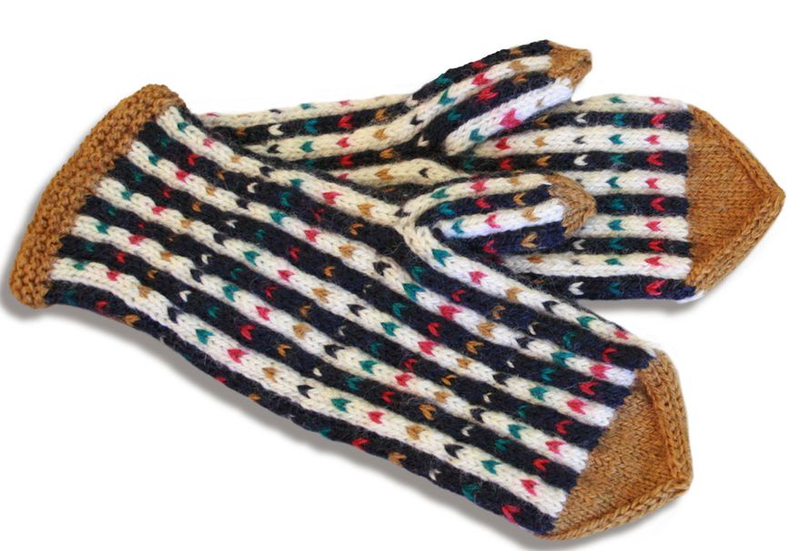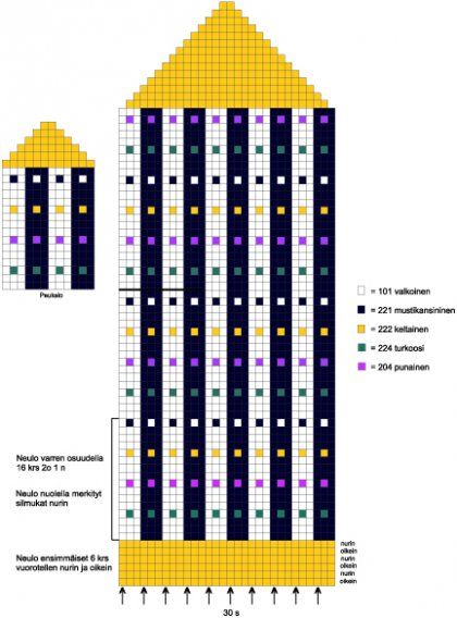 - Luo keltaisella 60 s ja neulo *1 krs oikein, 1 krs nurin* toista *-* 2 kertaa (yht. 6 krs). Aloita kirjoneule piirroksen mukaan. Neulo varren osuudella (16 krs) 2o 1n. Neulo varren jälkeen kaikki silmukat oikein. Katso peukalon paikka piirroksesta ja ota peukalon silmukat (12 s) apulangalle.