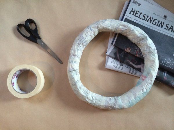 1. Tee pohjakranssi sanomalehdestä. Rullaa 10 sanomalehtiarkkia pinossa kulmasta aloittaen tiukaksi rullaksi ja kiinnitä teippaamalla. Rullaa kolme tällaista pötköä ja yhdistä ne teippaamalla päistään yhteen noin metrin mittaiseksi sanomalehtipötköksi.