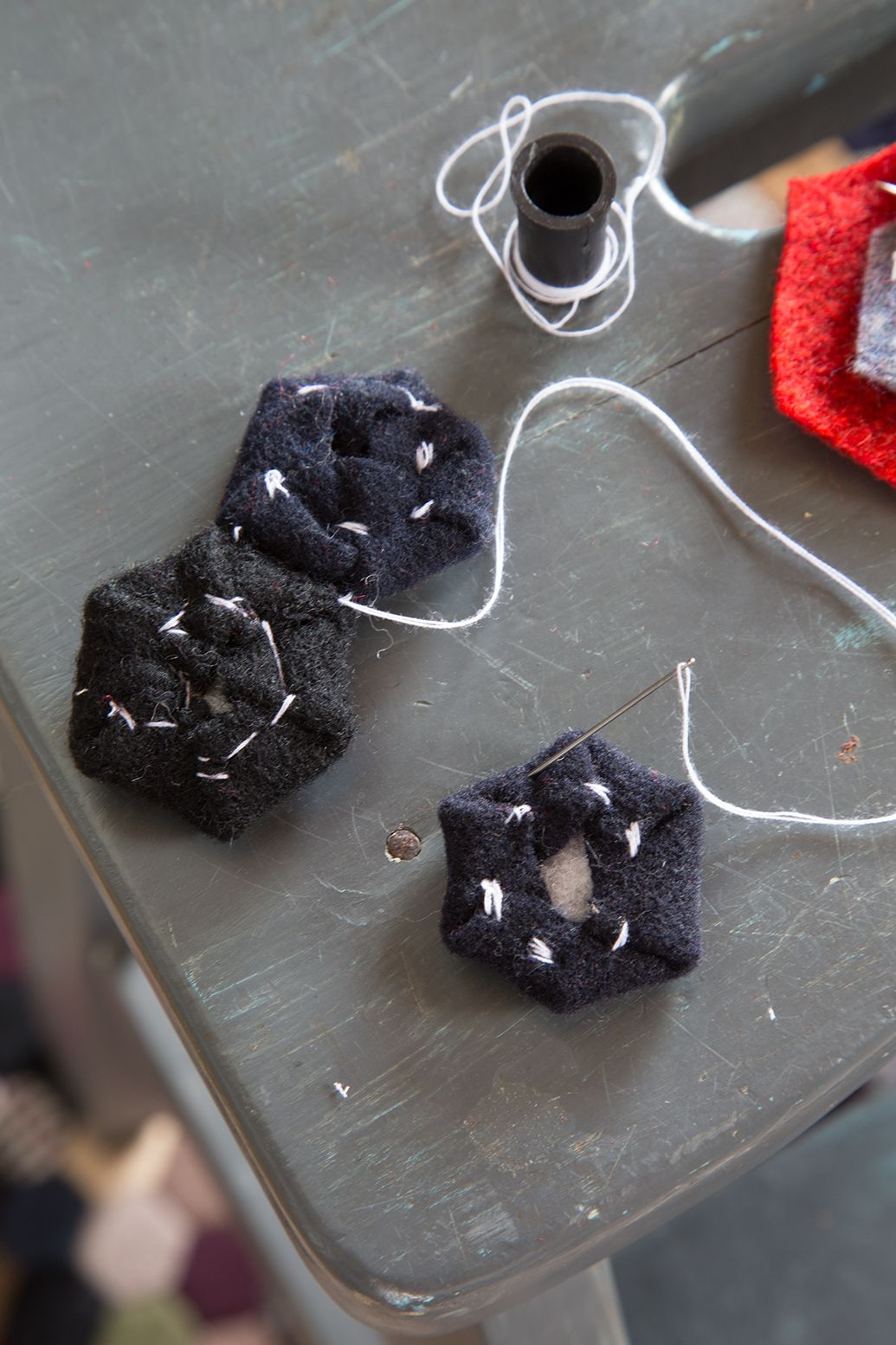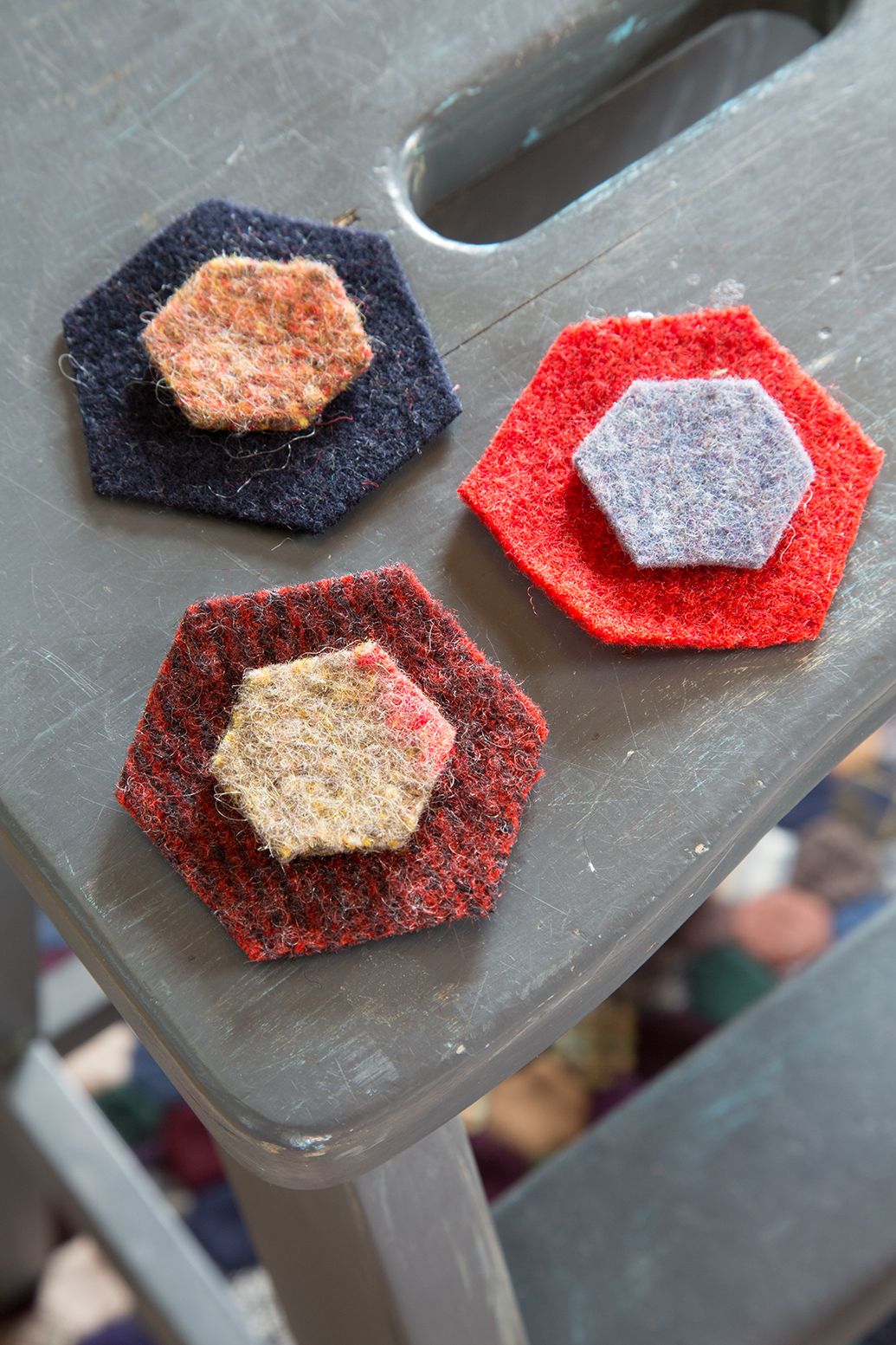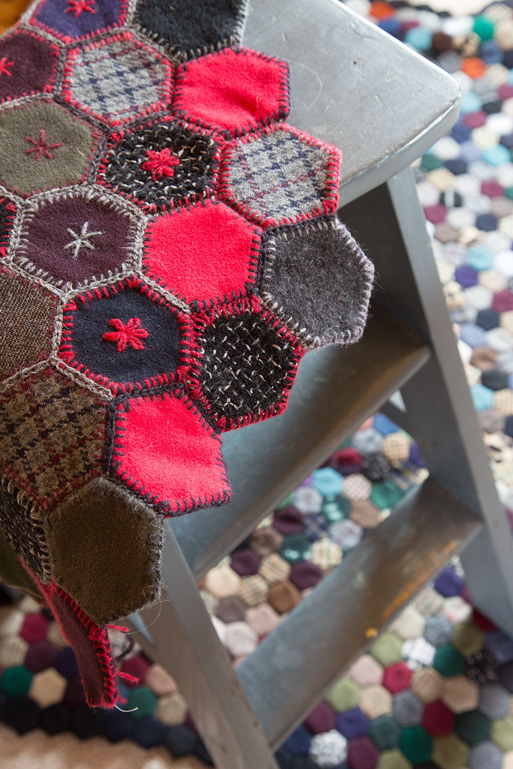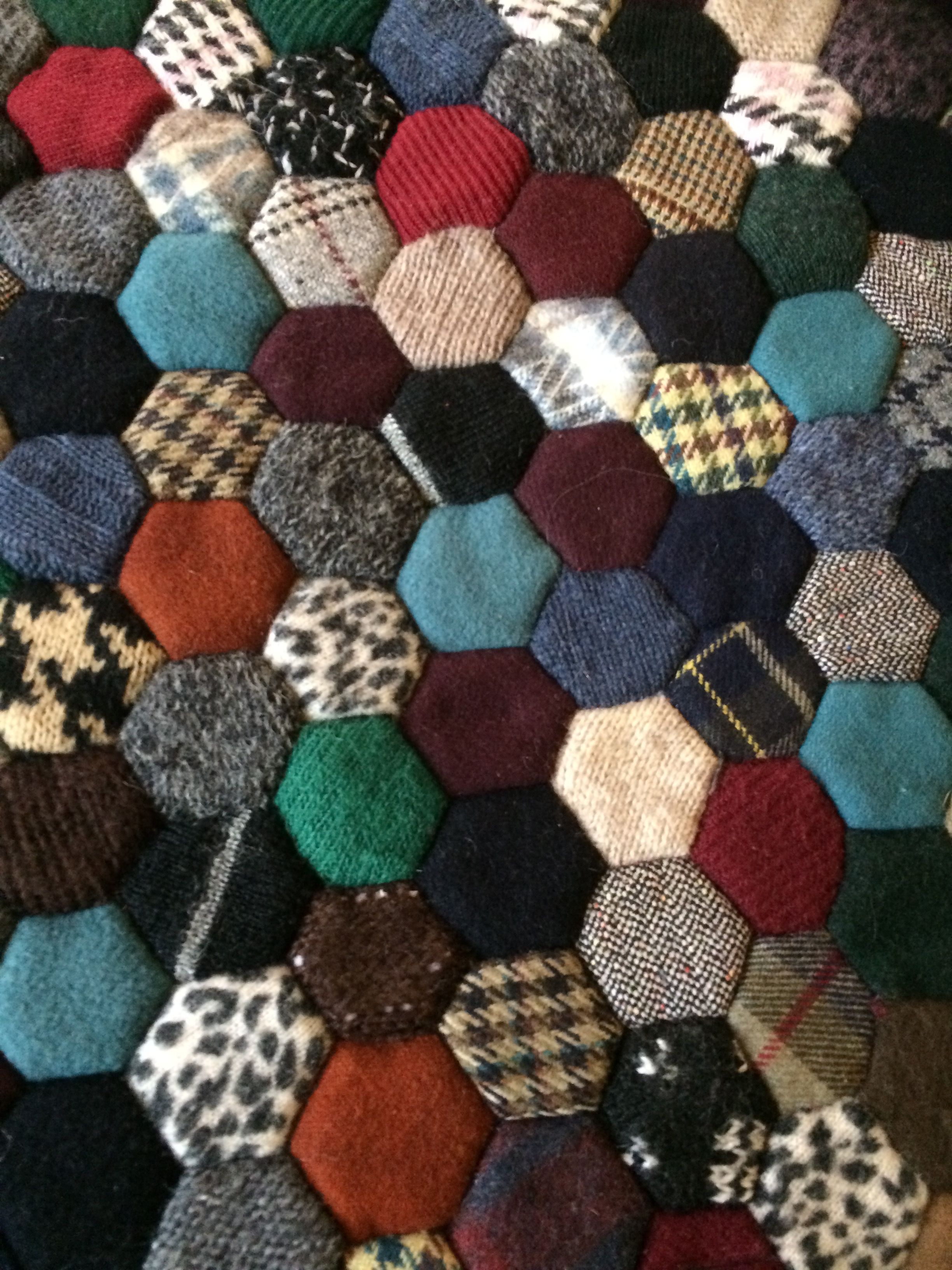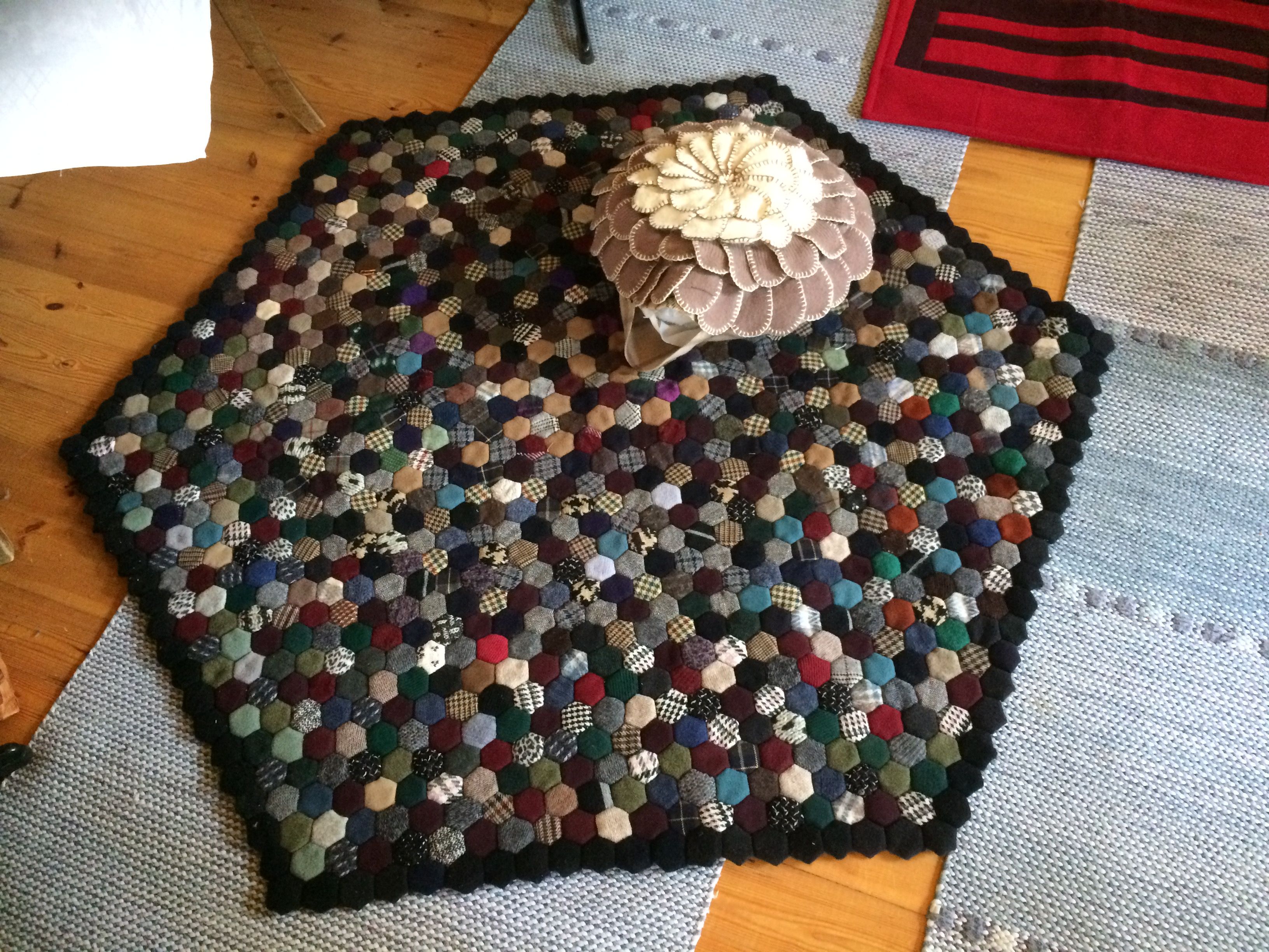 Ompele persoonallinen ja lämmin matto kuusikulmioista. Kaikki ovat kierrätysmateriaalia, vanhoja vanuneita villapaitoja, vilttejä ja huiveja.