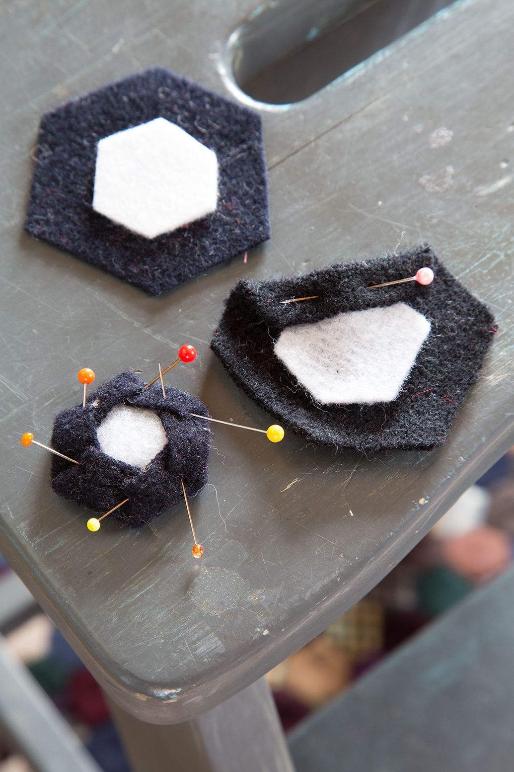 4. 4. Ompele kuusikulmioiden sivut tikkauslangalla toisiinsa yliluotellen.5. Kun olet ommellut työn haluamaasi kokoon, leikkaa koko maton kokoinen vuori 1 cm saumanvaroilla. Silitä saumanvarat nurjalle ja ompele vuori mattoon käsin nurjalta puolelta.