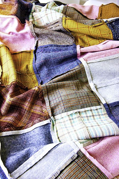 Ompele lämmin torkkupeitto käytöstä poistuneista villa-kankaisista bleisereistä, hameista ja housuista. Roosat, harmaat ja ruskeat tilkut muodostavat harmonisen kokonaisuuden.