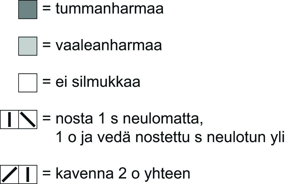 Lanka: 400-500-500-500-600-600-700 g tummanharmaata (04) ja 100 g vaaleanharmaata (02) 3-säikeistä Lankava Villava -lankaa (100 % suomalainen villa, 100 g = 180 m).