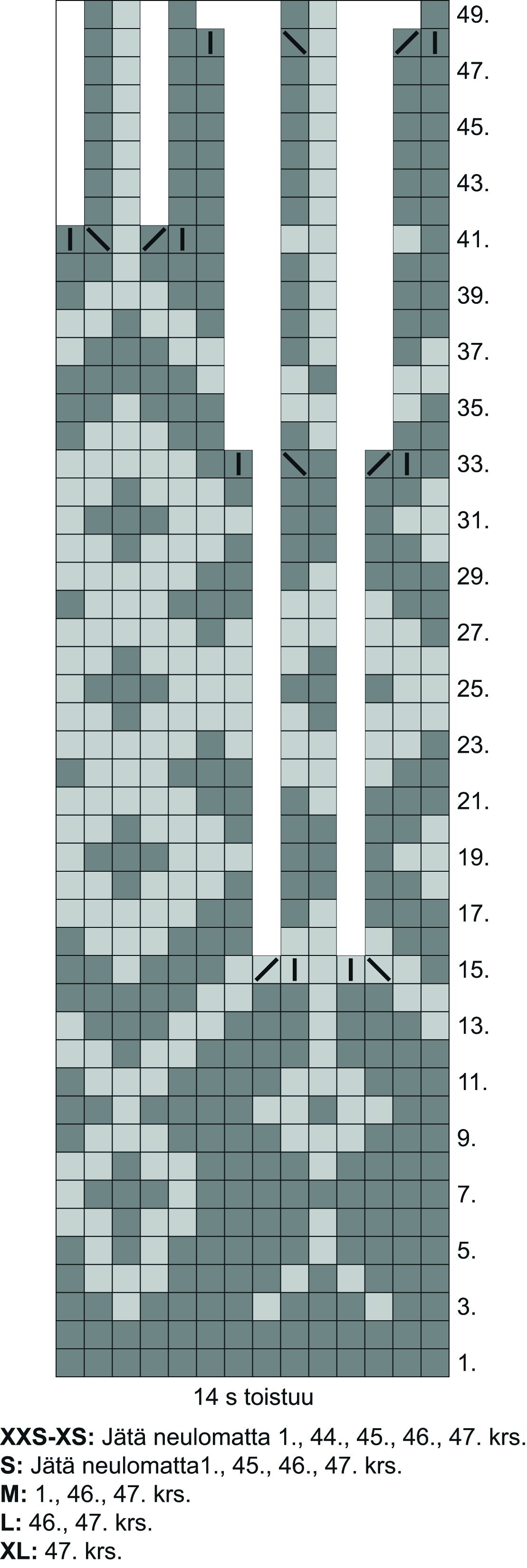 Neulo kirjoneule ja kavennukset alla olevan ruutupiirroksen mukaan.