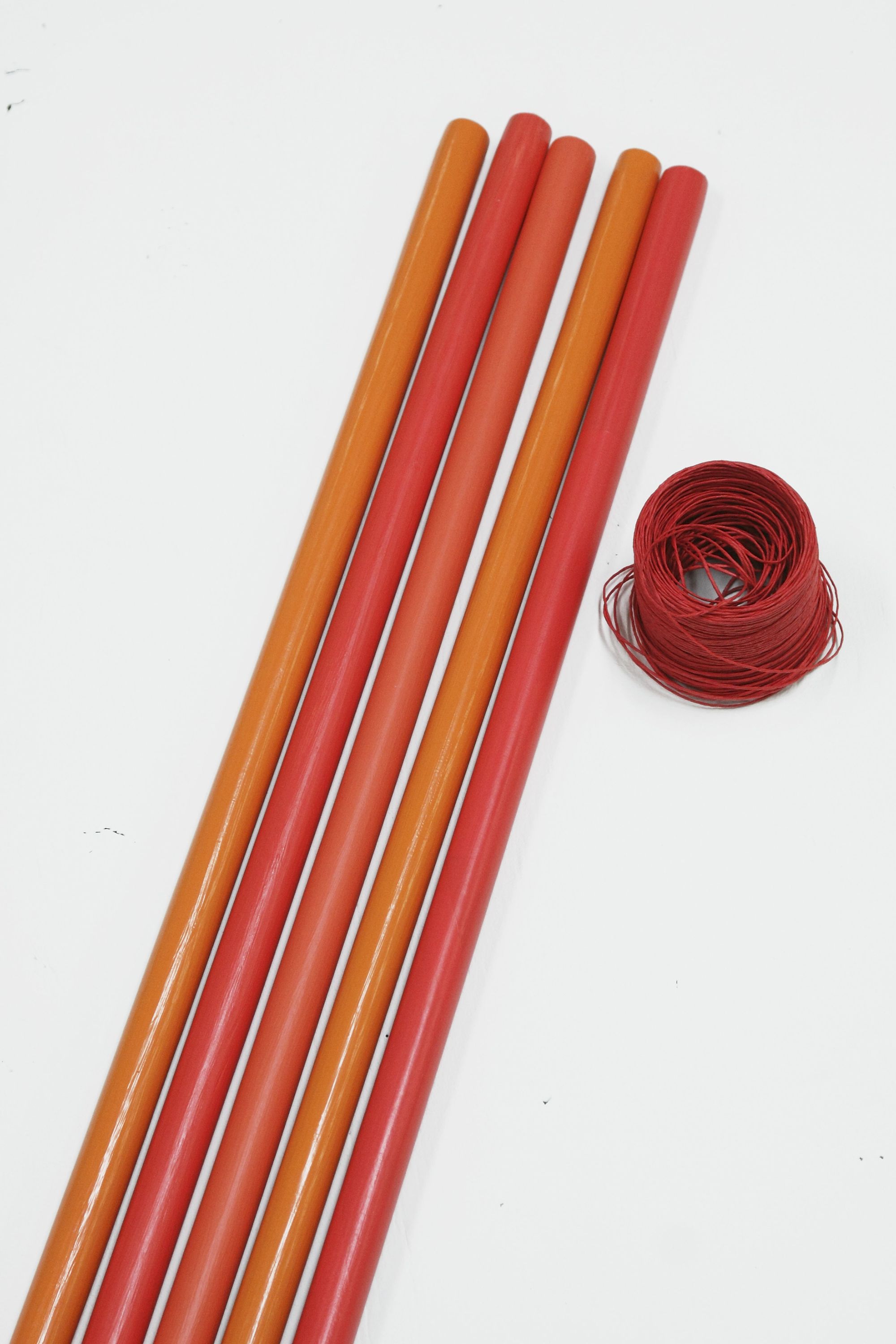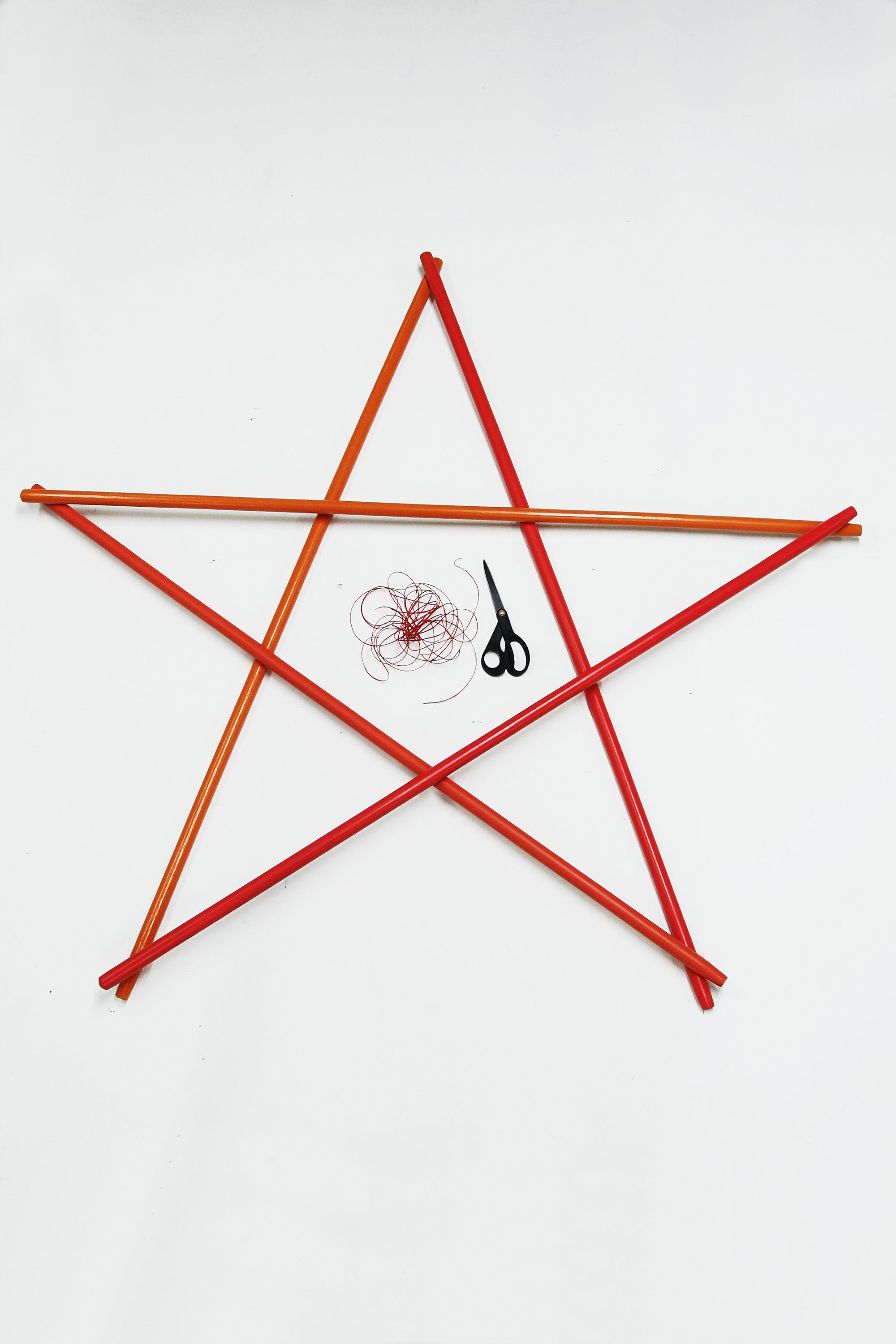 2. Nosta varret maalien kuivuttua työtasolle ja aseta ne viisisakaraisen tähden muotoon siten, että seuraava varsi asettuu aina edellisen päälle. Leikkaa tähdeksi solmimista varten kymmenen 40 cm:n mittaista narua.