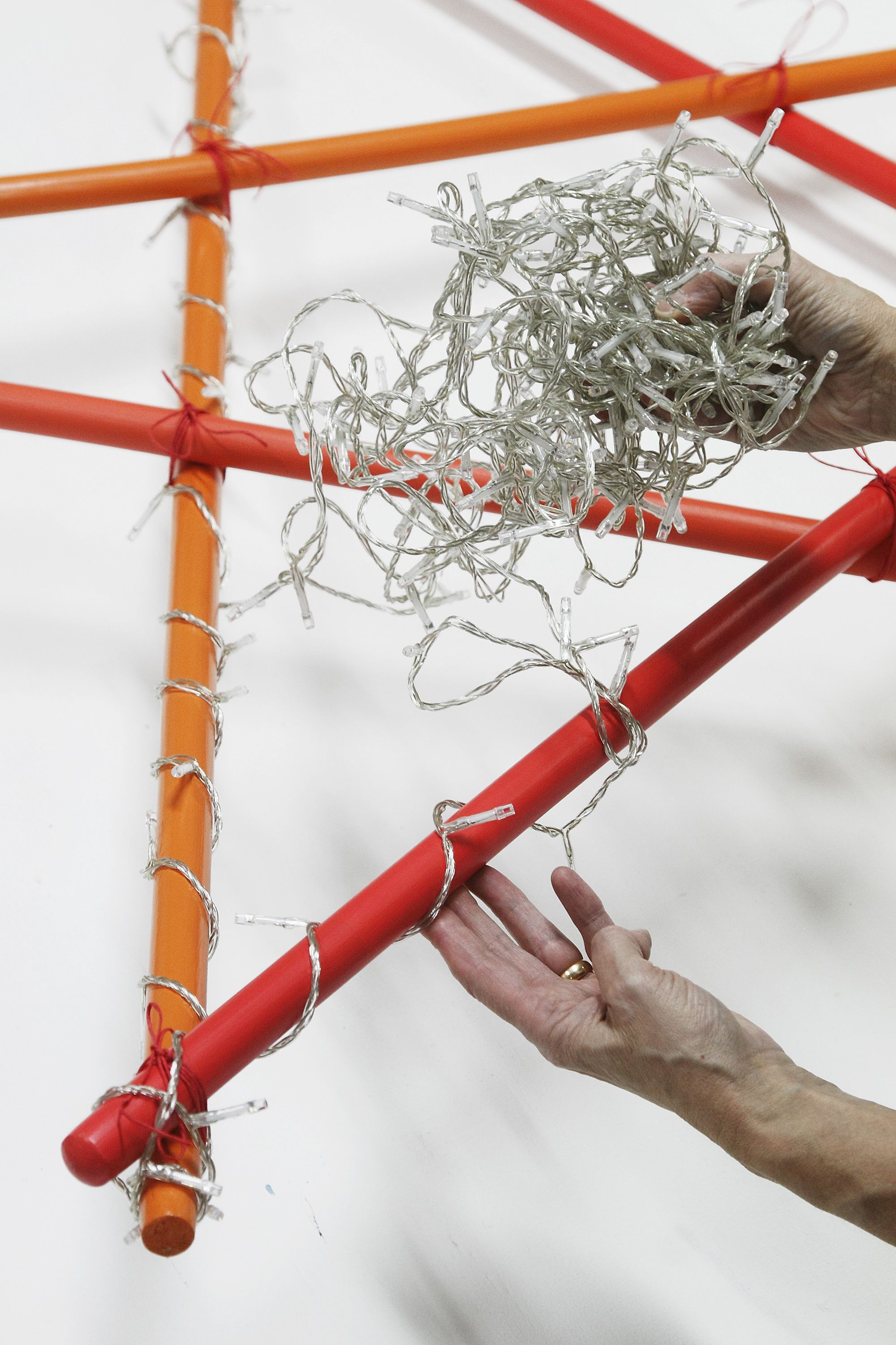 4. Kiinnitä valosarjan pää sakaran kärkeen, kerää nauha nipuksi ja pyörittele sitä harjanvarsien ympäri kunnes pääset takaisin lähtöpisteeseen. Pitkän valonauhan voi kieputtaa tihein kierroksin, jolloin tähteen tulee mahdollisimman paljon lamppuja.